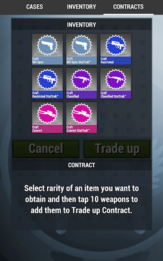 • Contracts tab - instead of deleting items, you can use them in Trade up Contract. Choose rarity of item you want to obtain and provide 10 skins of inferior rairty. All 10 weapons will be traded for one new random weapon with superior rarity.