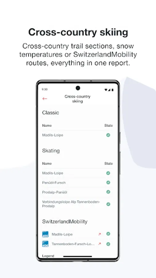 The Swiss Snow app from Switzerland Tourism can easily provide answers to these questions and many others. The extensive winter database contains snow and ski lift information for over 200 Swiss winter destinations. The database is updated several times a day and provides detailed information relating to the following winter sports: skiing, snowboarding, cross-country skiing, tobogganing and winter hiking.