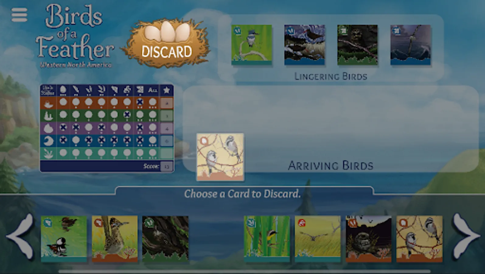 Enjoy a birding adventure any time with this quick and easy-to-learn card game about spotting and watching birds. You’ll travel to different habitats along western North America to admire the gorgeous birds living there in this solo game. Decide which birds to play to score big in the different habitats... and which birds to let fly free to make room.