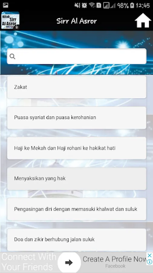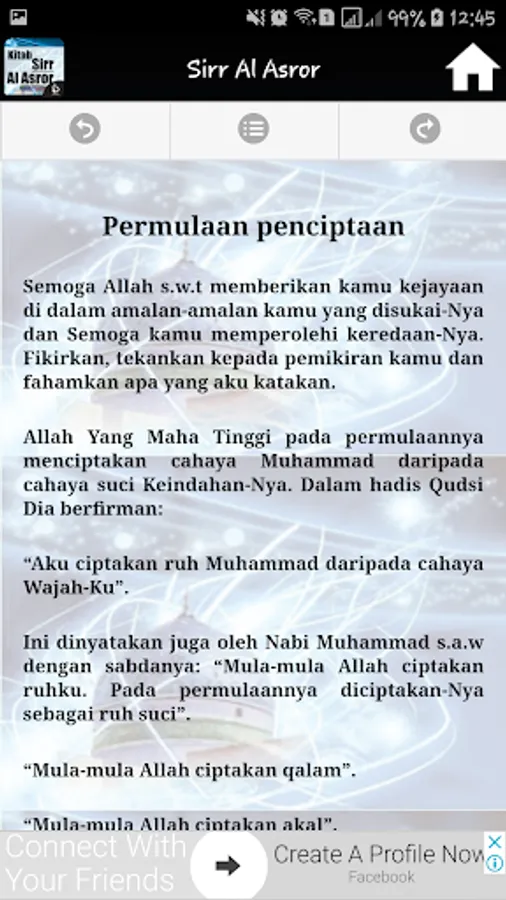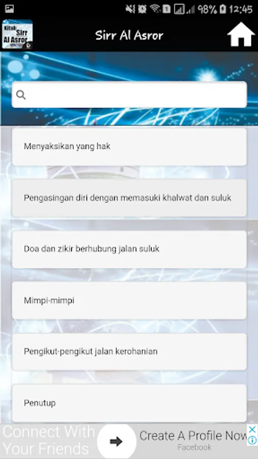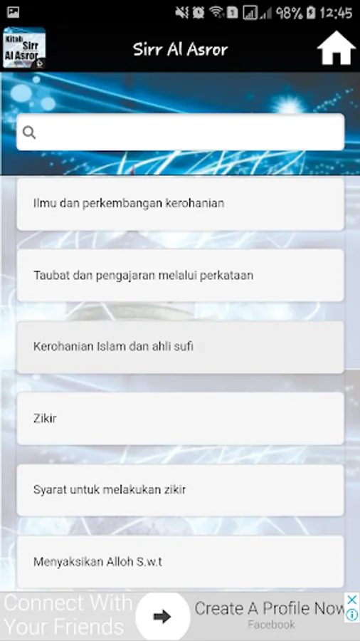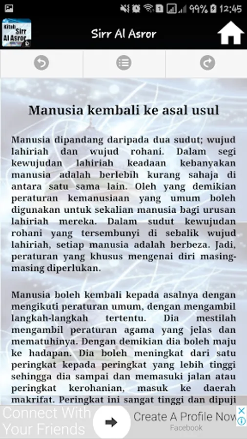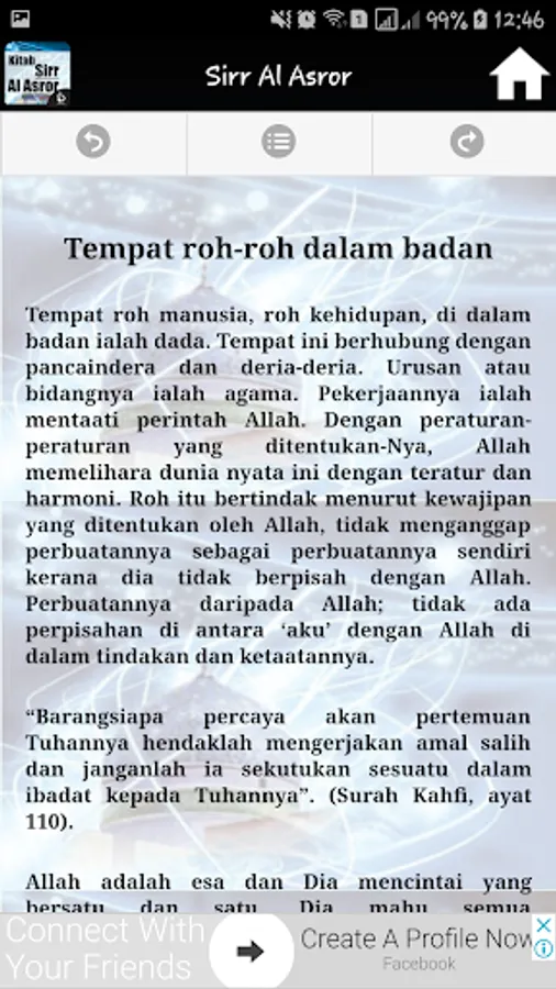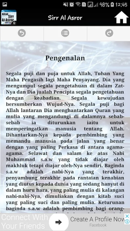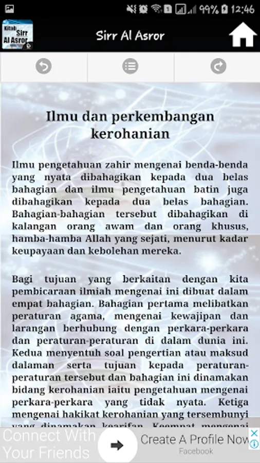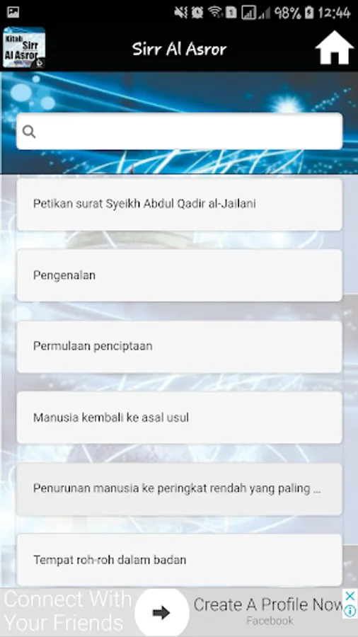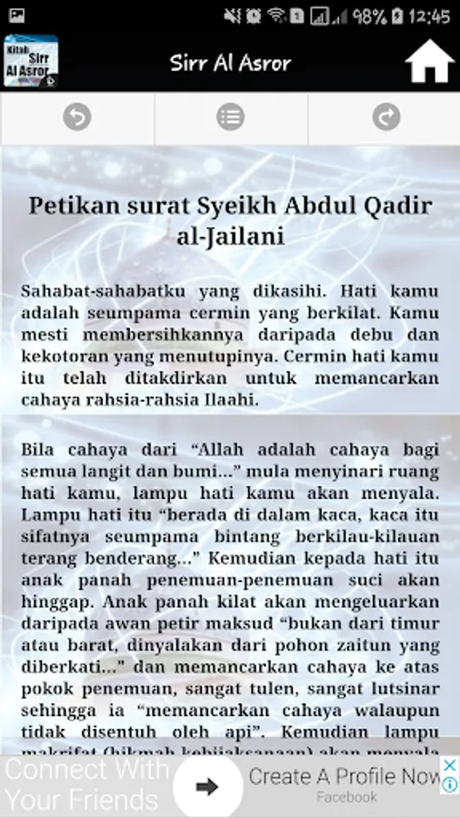 Application Kitab Asrar Sirul secret behind all this is the secret of life, Sirr al Asror, creation of Sheikh Abd al-Qadir Based Jilanimerupakan OFFLINE, which you can use without an internet connection, making it easier for you to use the application, whenever and wherever keep learning.