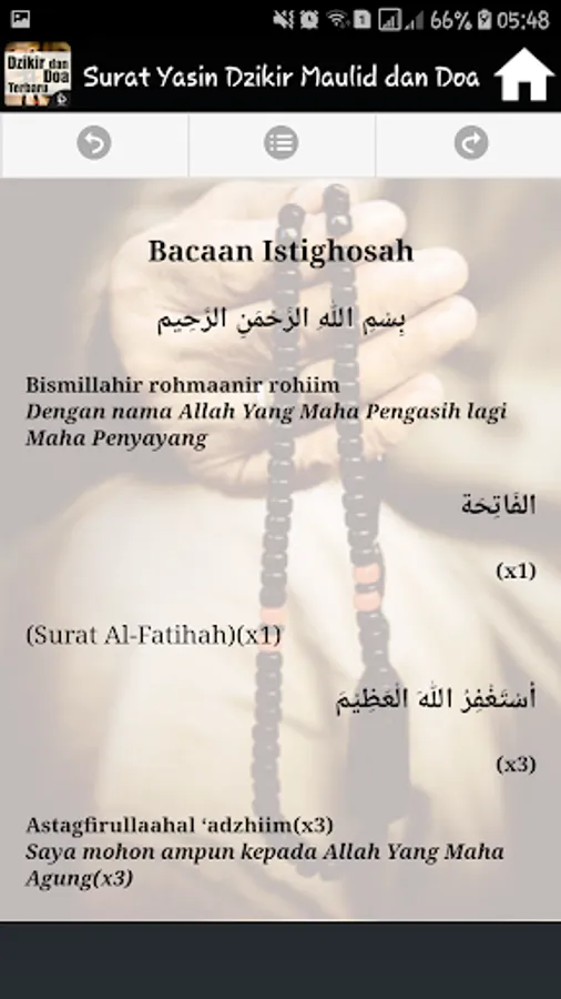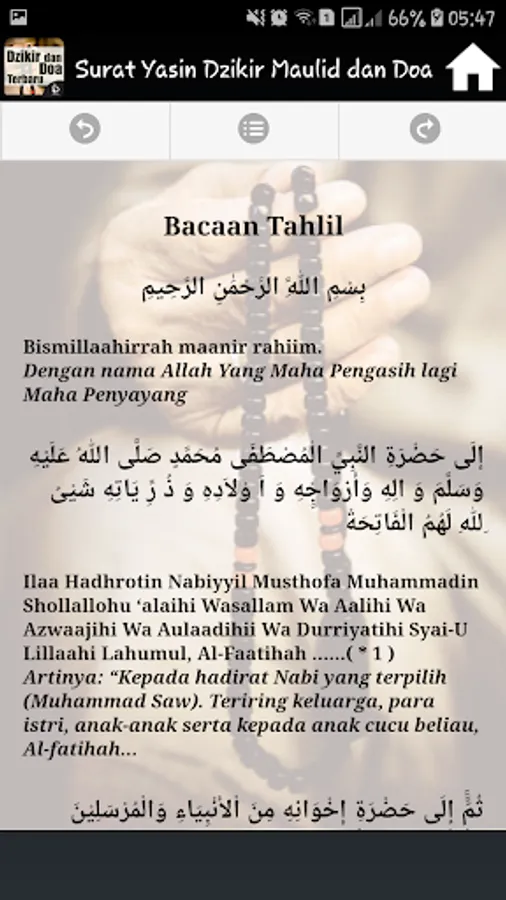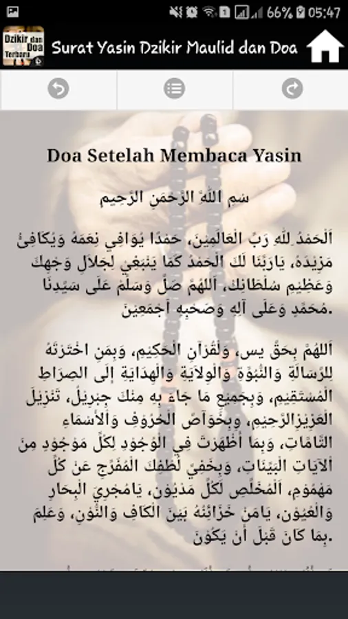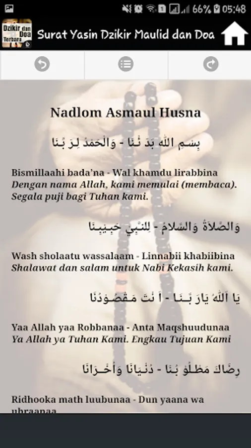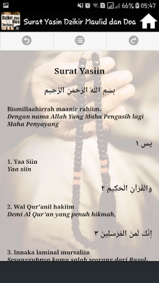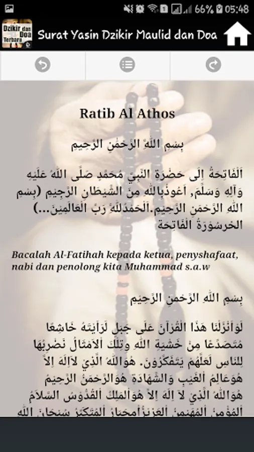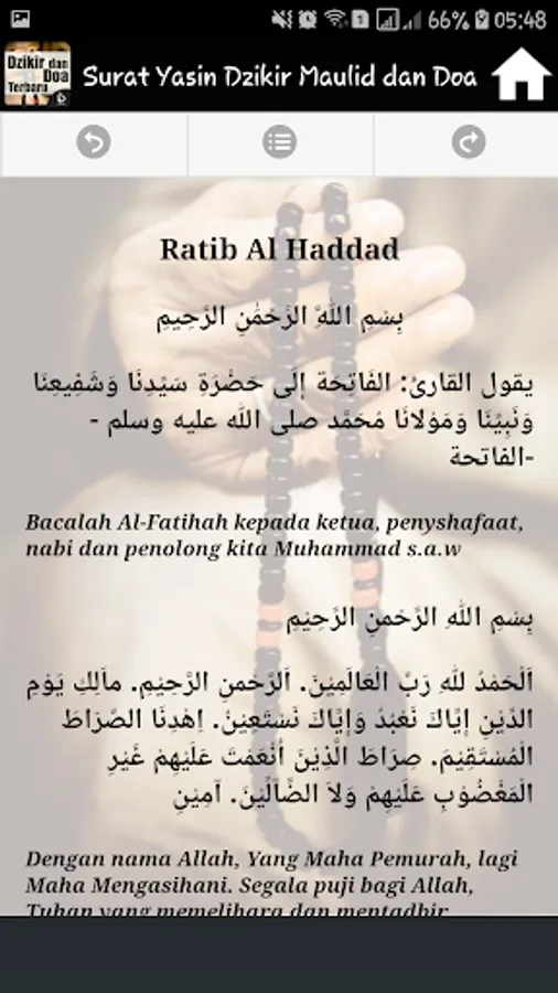 It Contains Complete applications into one application Surat Yasin, Dhikr Pagi Sore, Mawlid, Ratib and prayer is accompanied by a Latin inscription and its translation