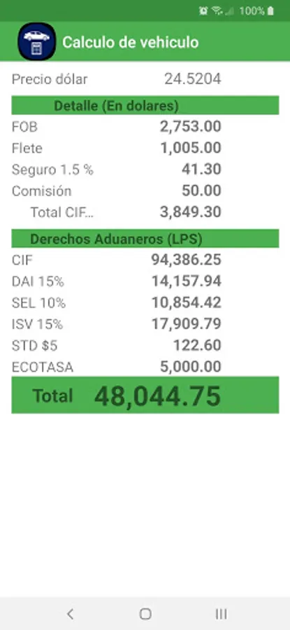 Calculate DAI, SEL, ISV, STD, ECOTASA taxes for introducing a vehicle to Honduras.