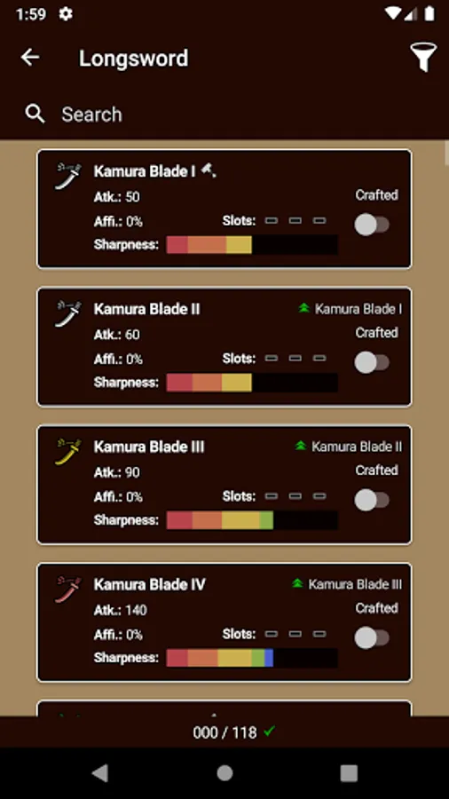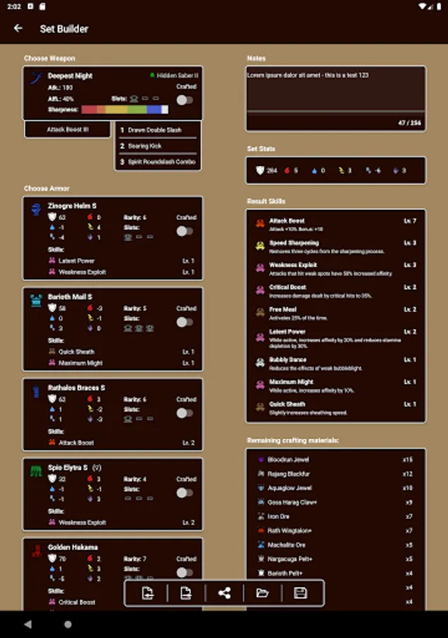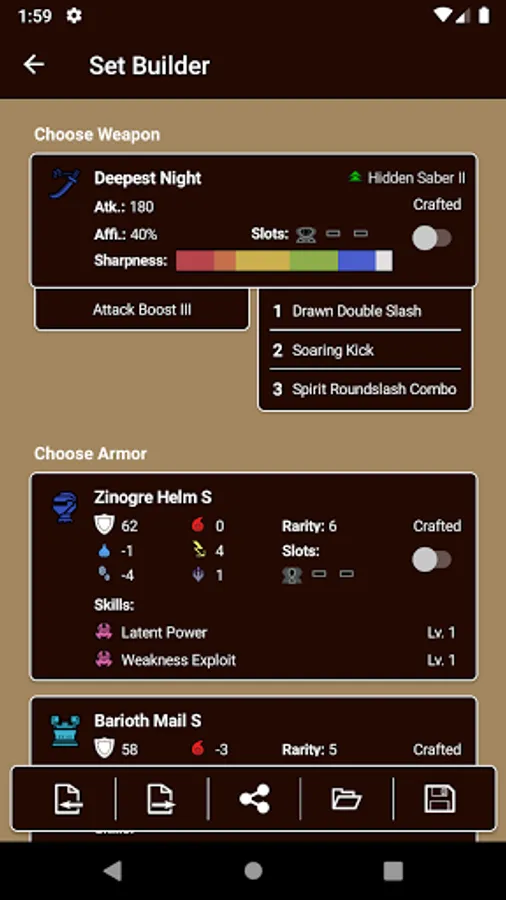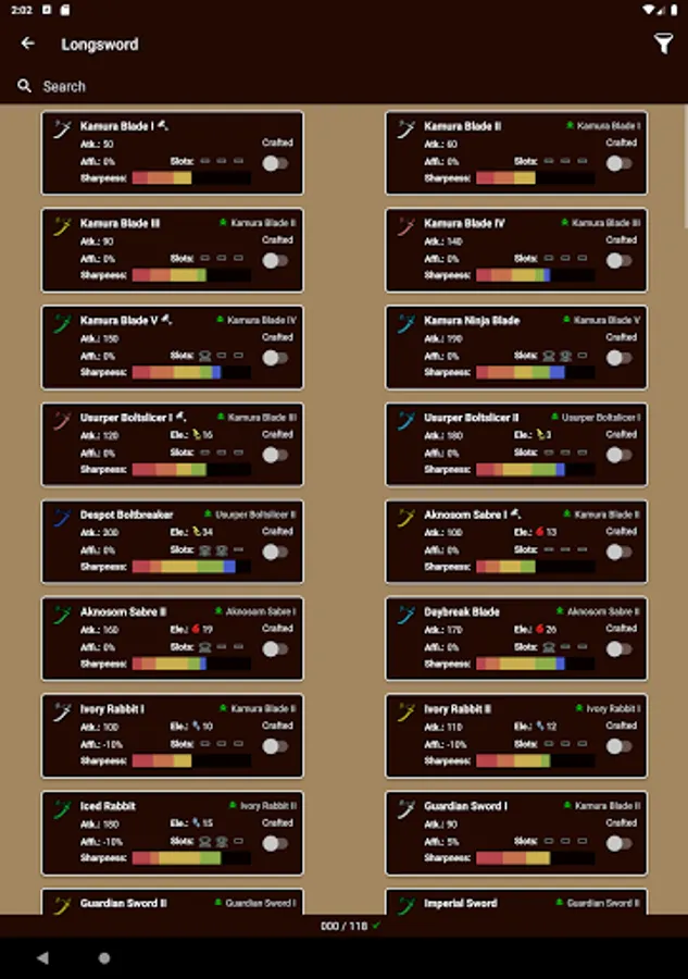 - Weapon Stats (Attack, Element, Sharpness, Crafting Materials, etc.)