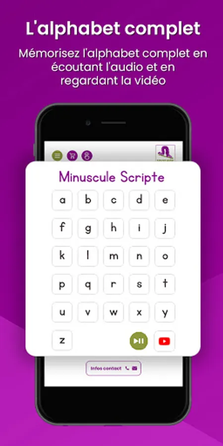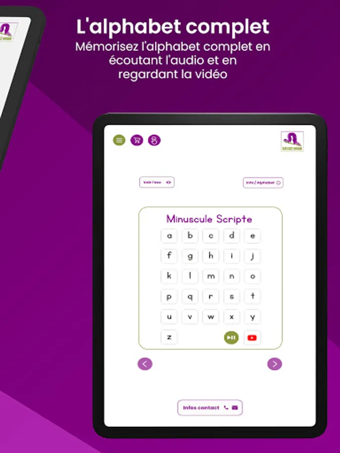 - Full alphabet lessons, audio and video included, concerning each of the letters in order to better discover them
