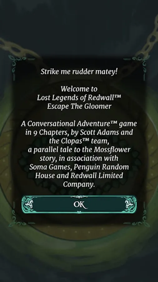 One of a series of six games, THE LOST LEGENDS OF REDWALL™: ESCAPE THE GLOOMER© is created in partnership with Soma Games, and owned by The Redwall Abbey company™, Soma Games, and Penguin Random House UK™. The Lost Legends of Redwall™: Escape the Gloomer© is a Conversational Adventure™ game in nine chapters developed by Team Clopas.
