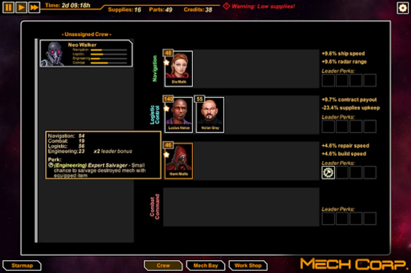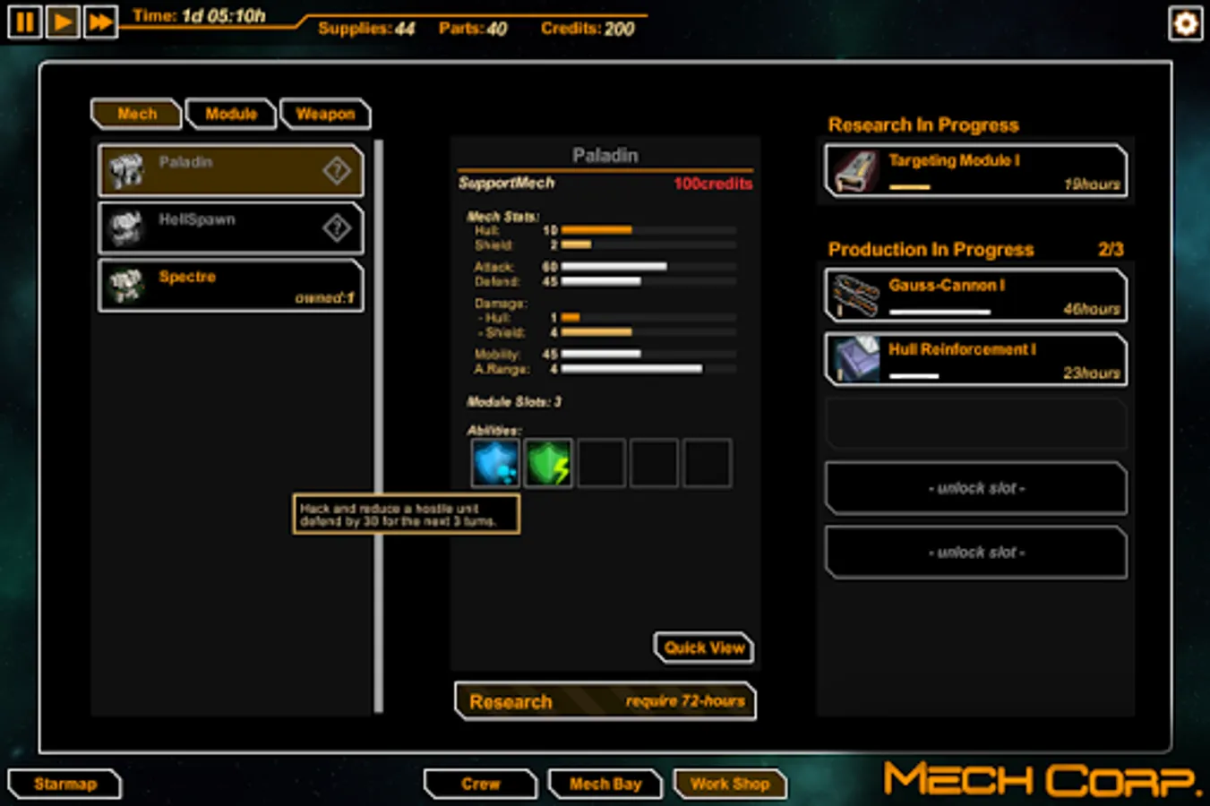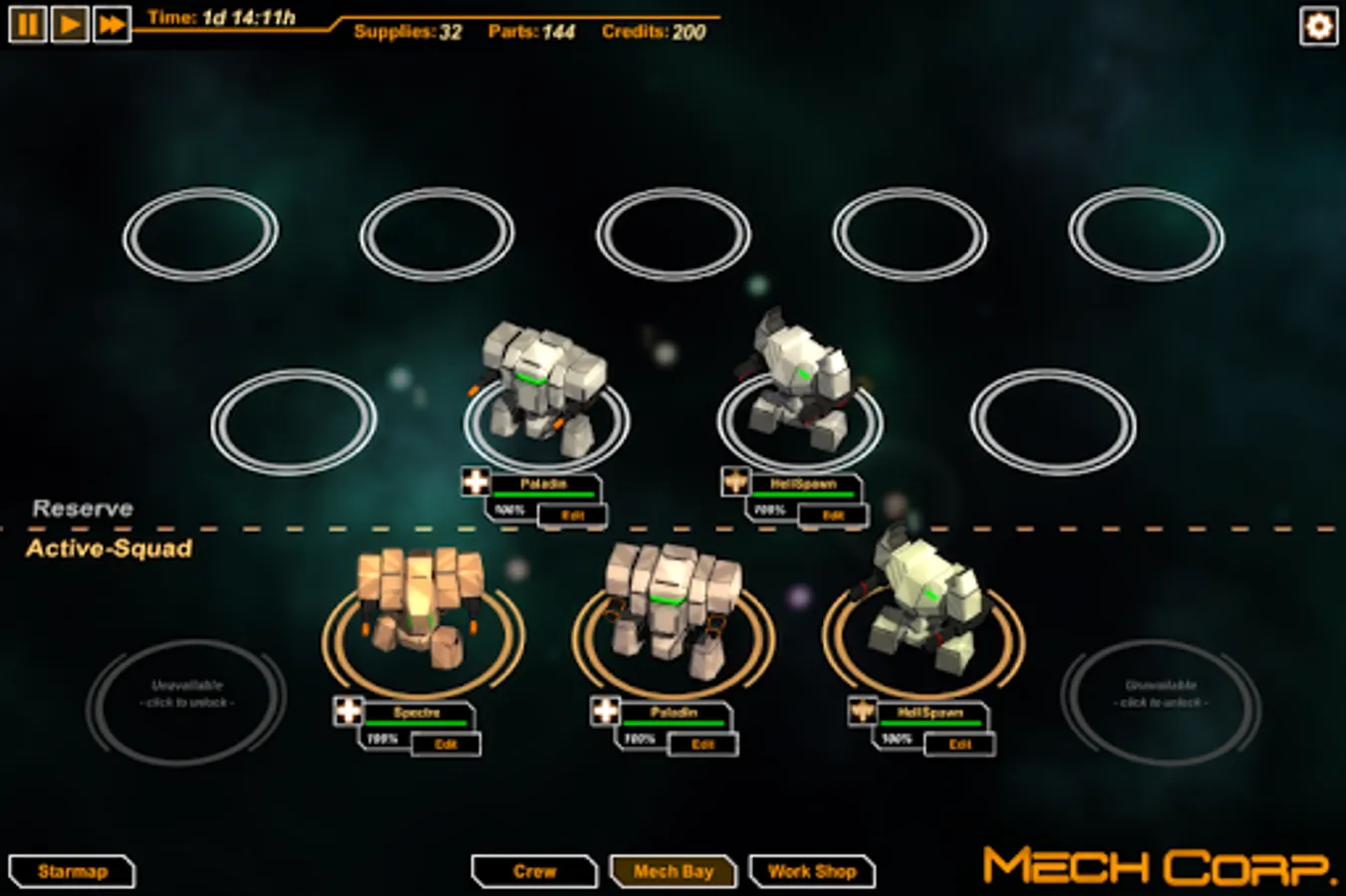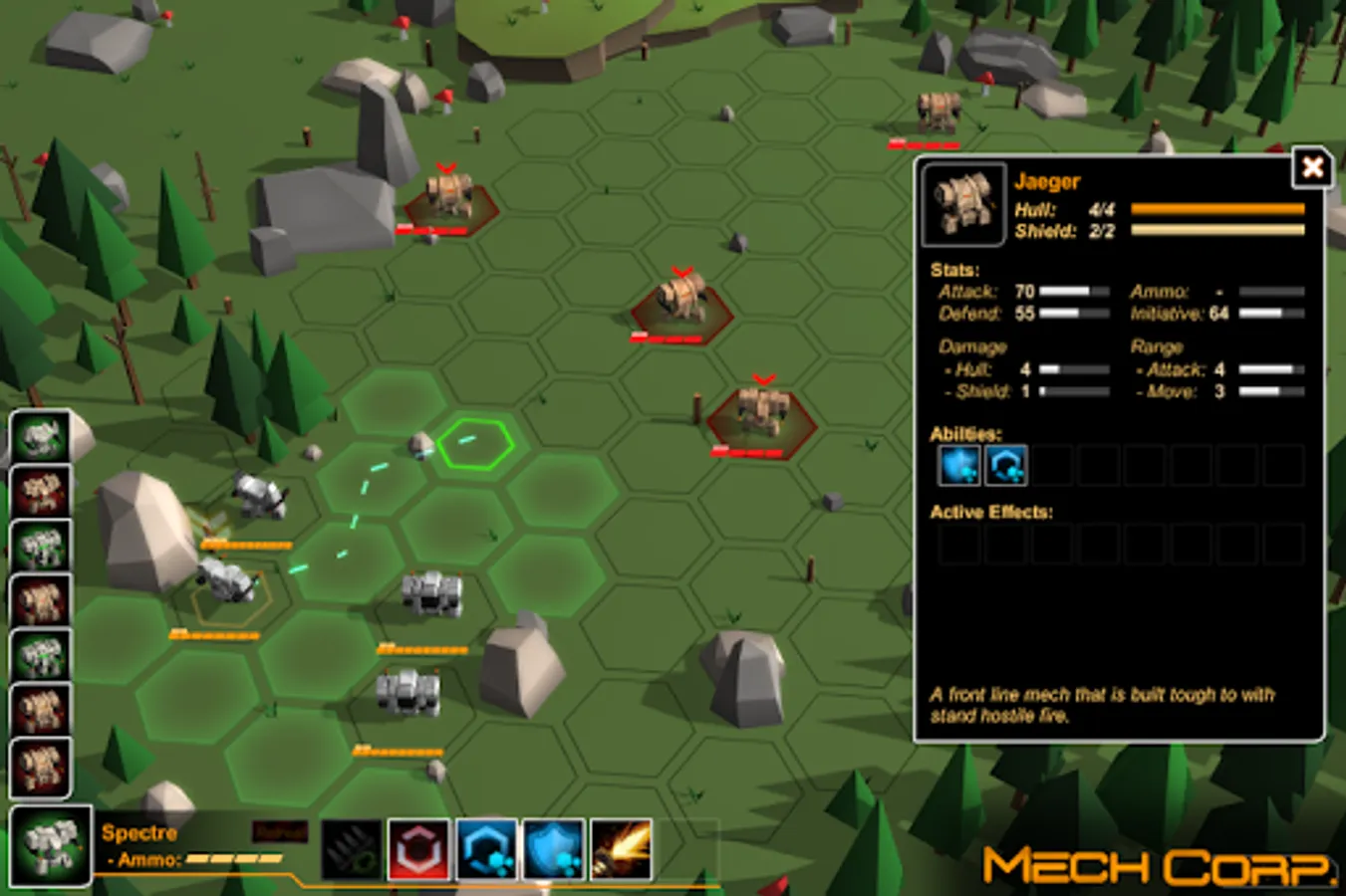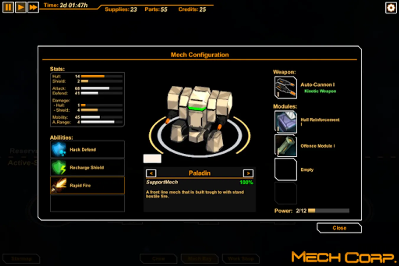 MechCorp. is a turn-based-tactics/strategy game where you take command of a mercenary mech squadron in space. Decide which battles to fight and what contracts to pursue while managing every aspect of the squad including mech lineup, crew management, research and production.