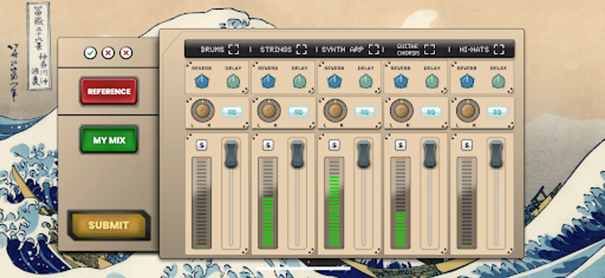 Toggle between a 'Reference Mix' and 'Your Mix' and balance 'Your Mix' to match the 'Reference Mix' as accurately as possible. The higher your accuracy SCORE, the more COINS you earn!