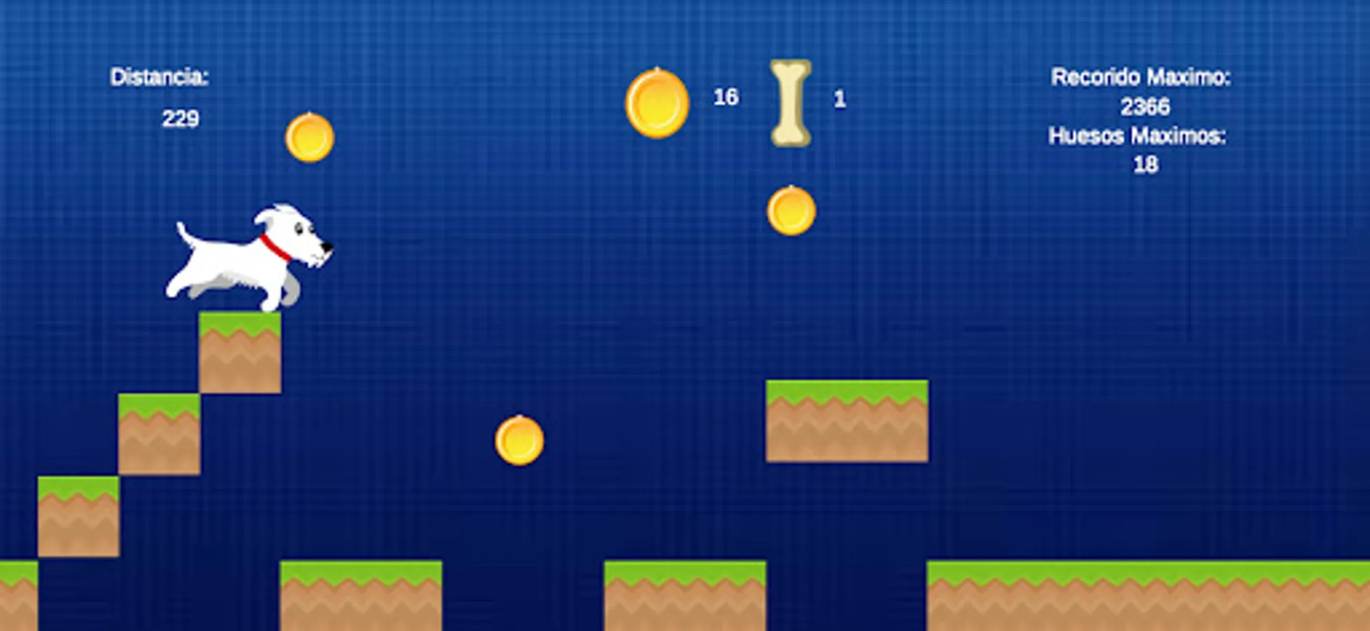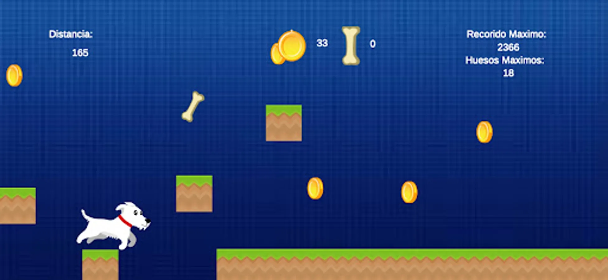 A white puppy of the schnauzer breed jumps through the different platforms trying to collect the maximum amount of coins, for every 20 coins collected he can obtain a bone that allows him to activate a bark, the game consists of collecting the maximum number of bones and establishing a distance record for boys and girls to make their comparisons and be interested in breaking it.