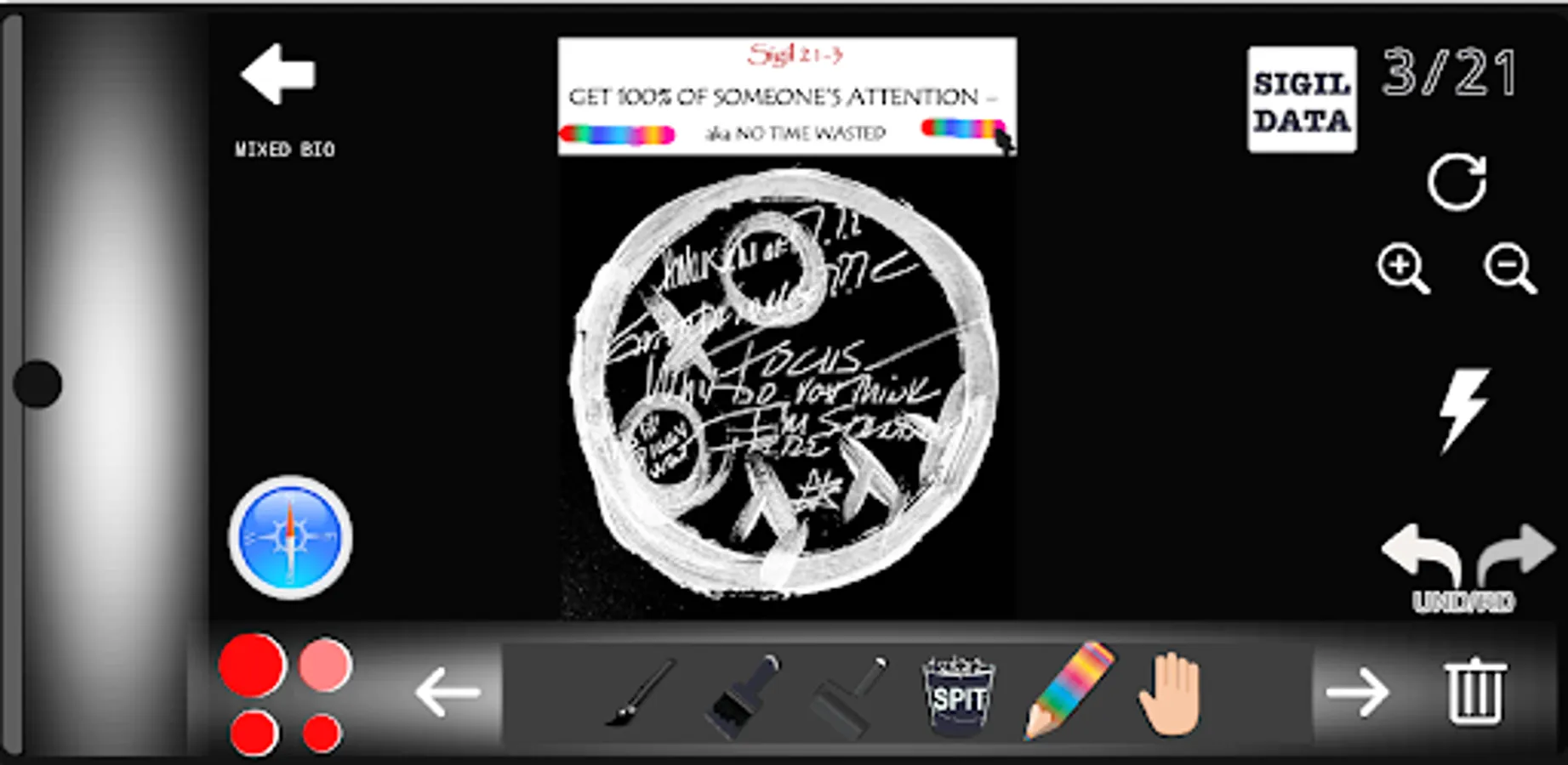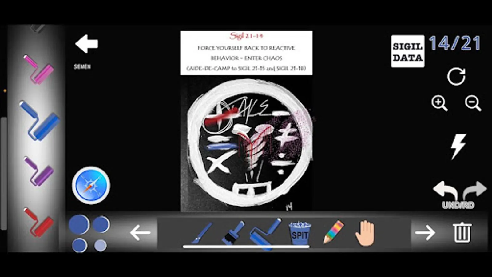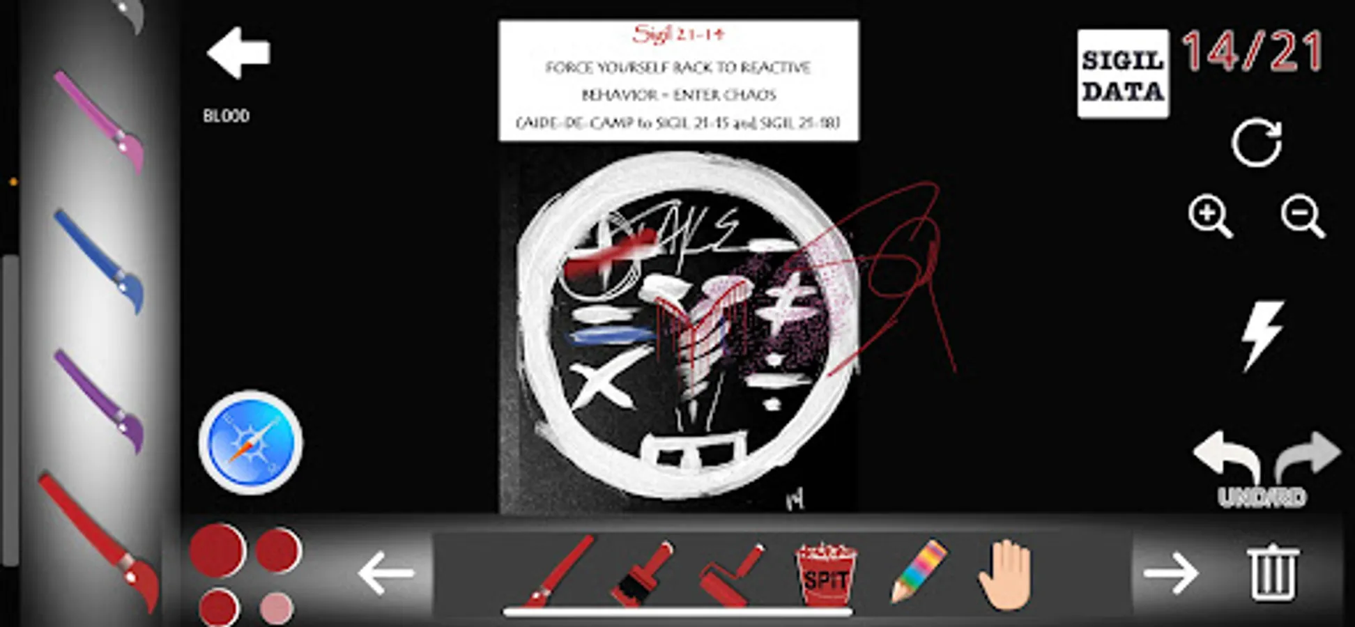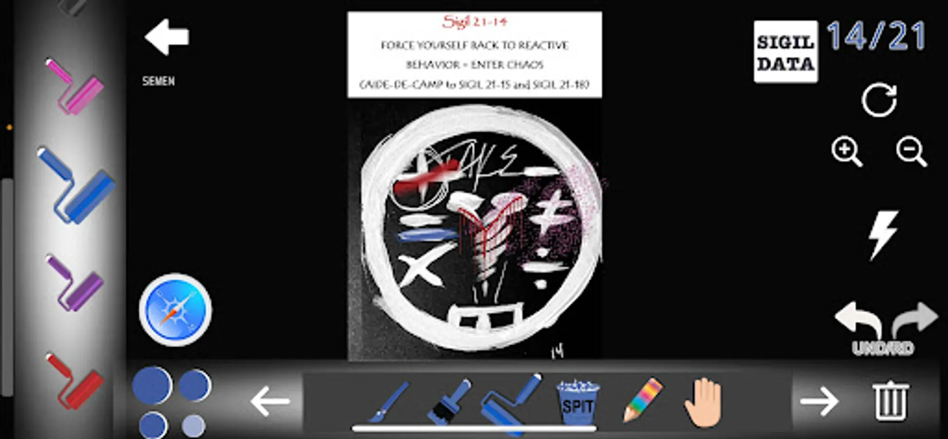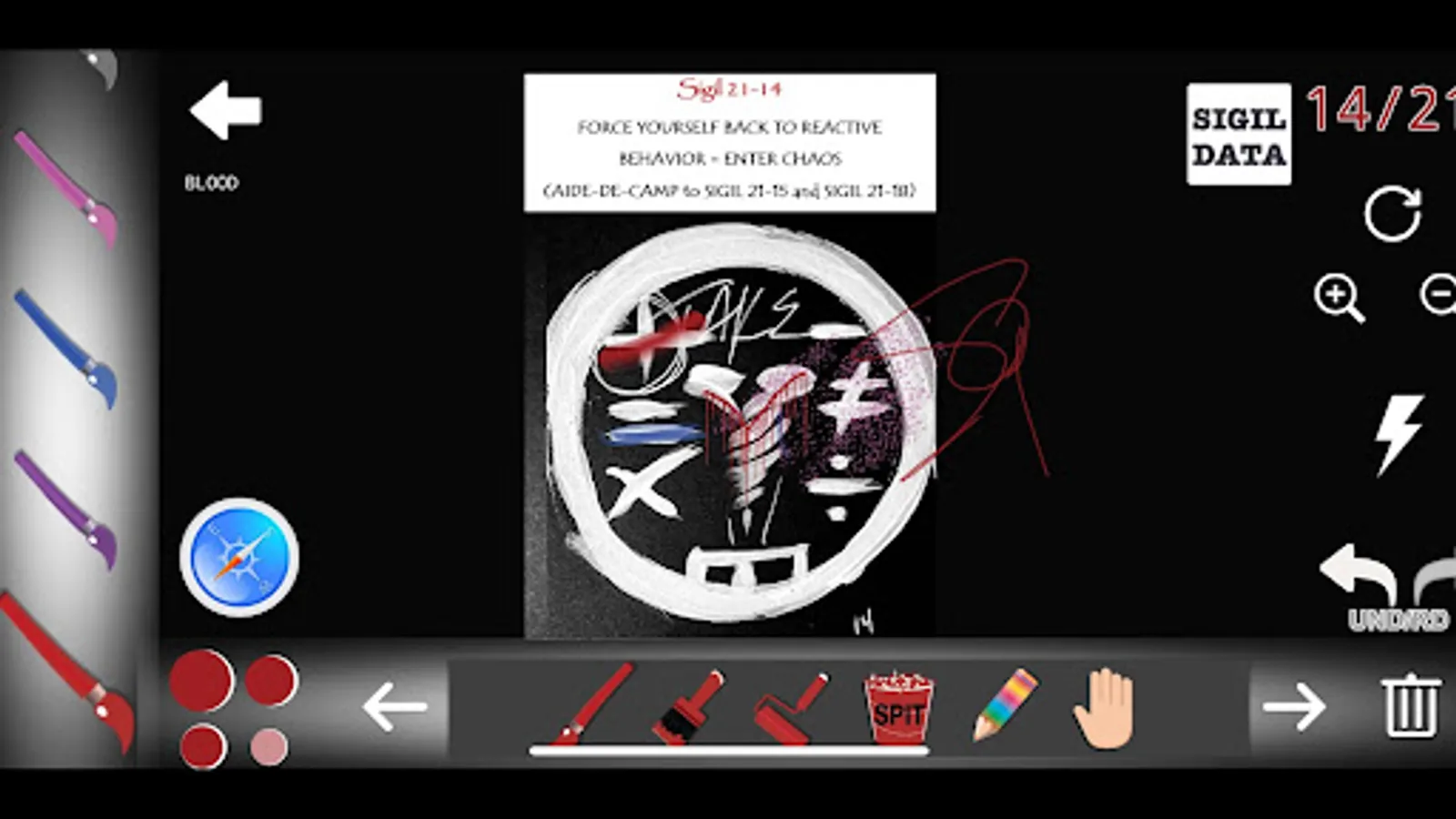 Now you can choose the Sigil which fits your requirements and make it your own. The App provides 9 colors which perfectly match the colors used in the book form. They user can use a paint brushes with delicious dripping built in, or a roller for transparency – and even a “Spit Bucket” to splatter the sigils with materials. There is even a multi color tool.