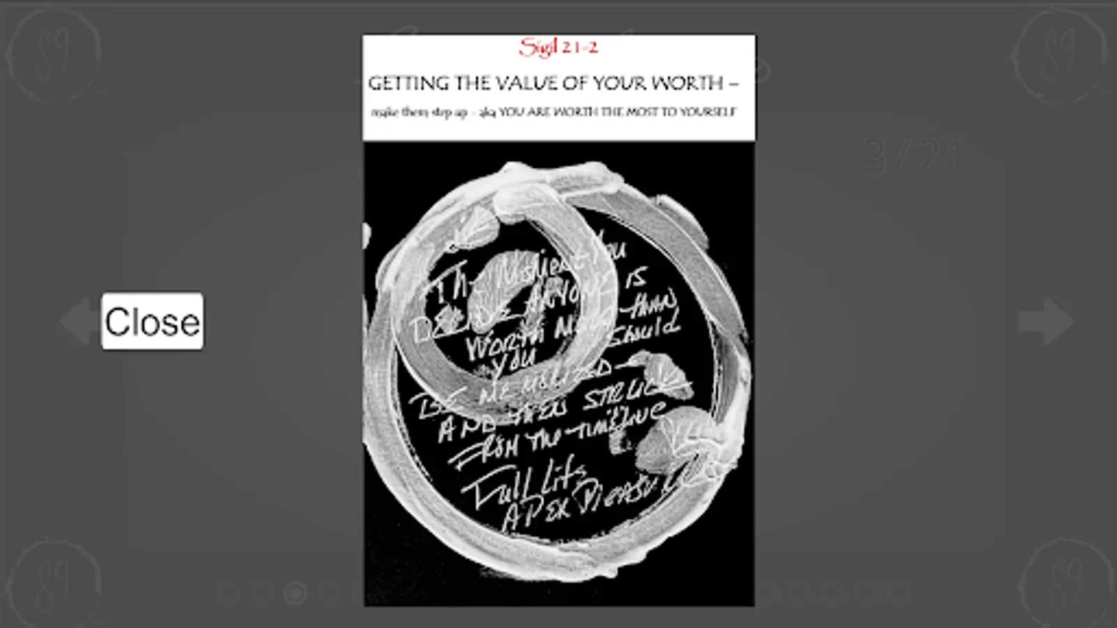 When you are done the App allows for a screenshot on a second screen with only your finished piece. Screenshot your work and create a personal library of custom Talismans built on the Sigils.