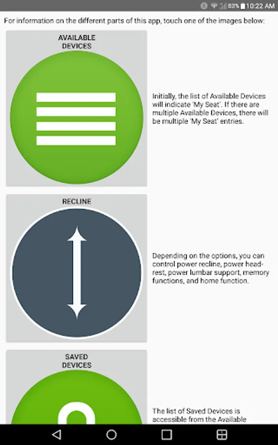 The app allows you to connect to your enabled furniture via Bluetooth from your phone or tablet. Depending on the options, you can control the electric motors that move your chair or sofa and may include power recline, power headrest, power lumbar support, memory functions, home function, light, cooling cup, heat, and massage.
