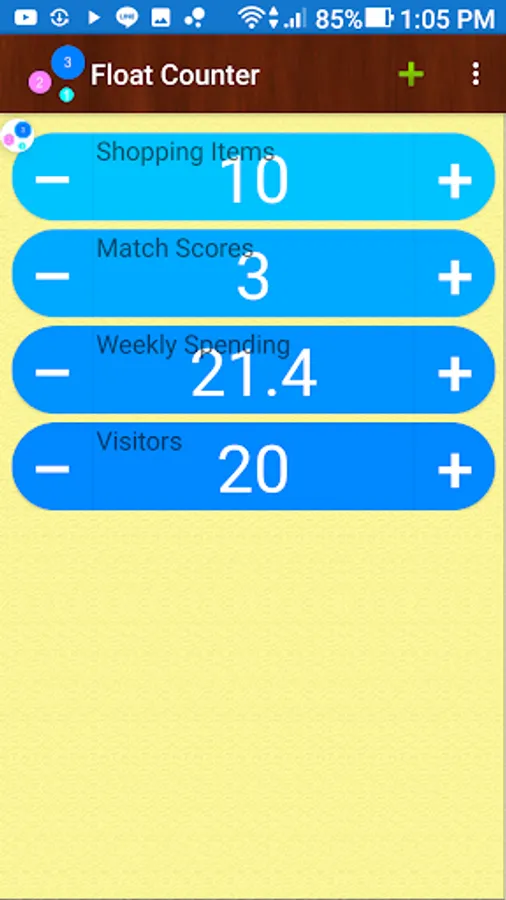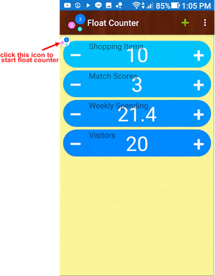 -This is a convenient counter that can float anywhere on screen. you can count anything, visitors number, swimming times, matche scores, inventory items, smoking cigarettes, ...