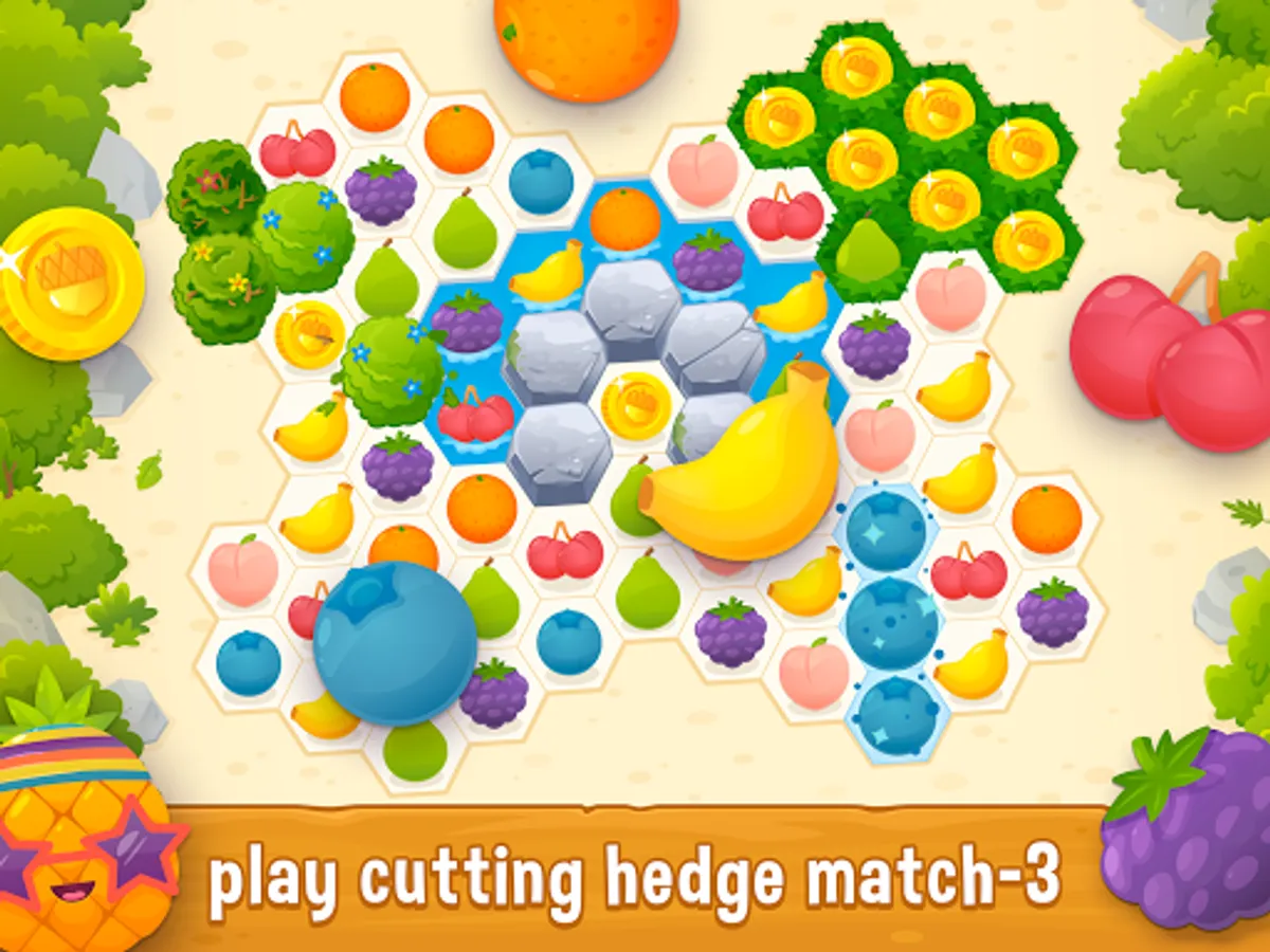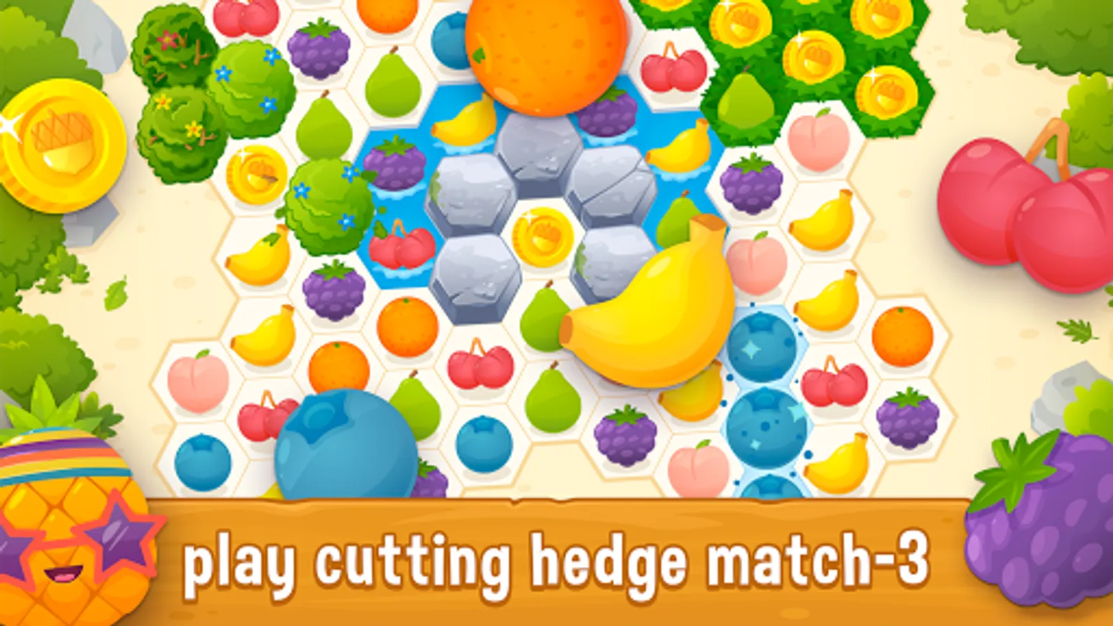 • Match fruits and collect coins to beat levels, then use them to expand and decorate your garden.