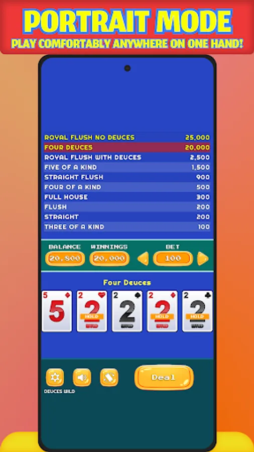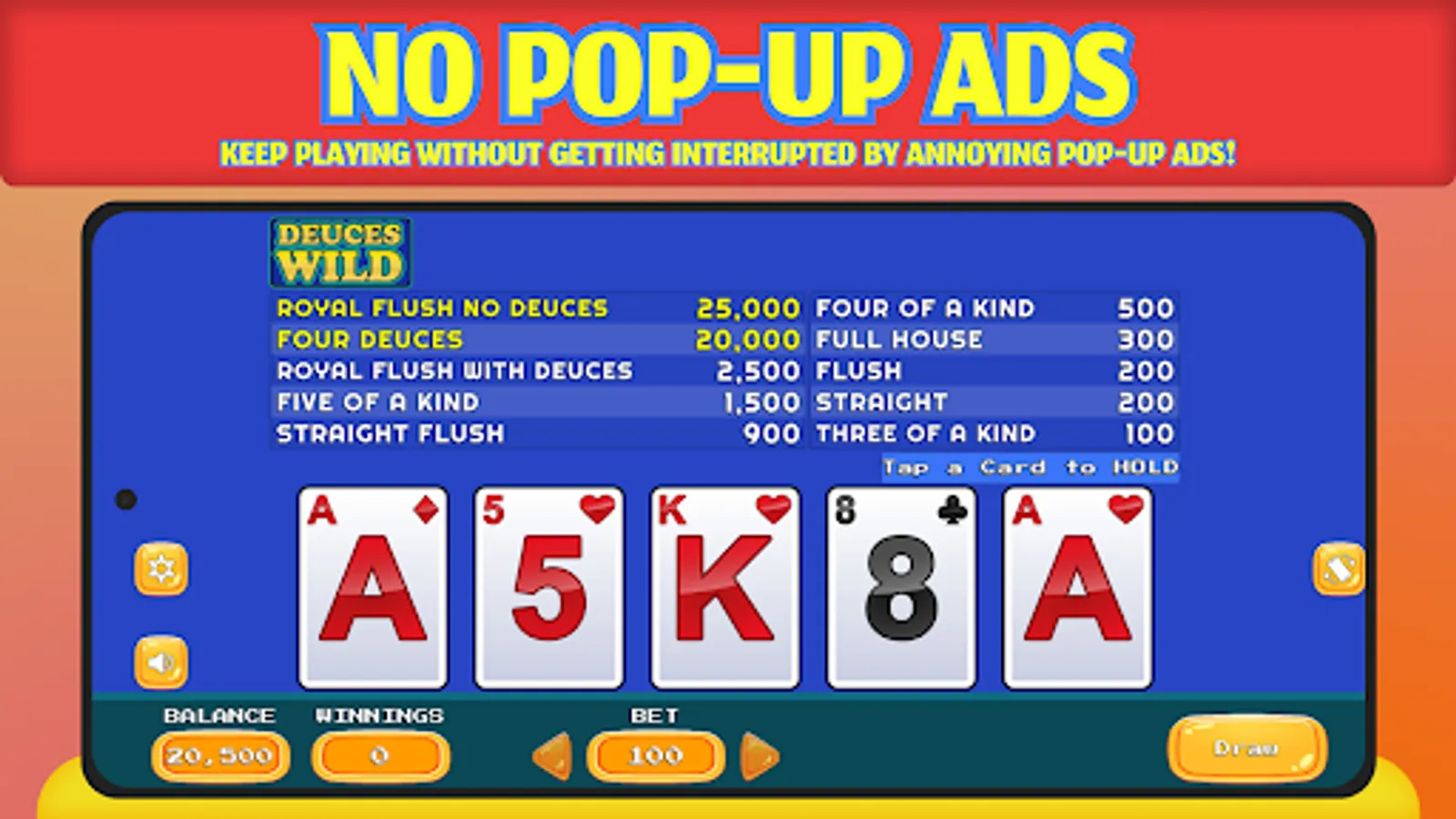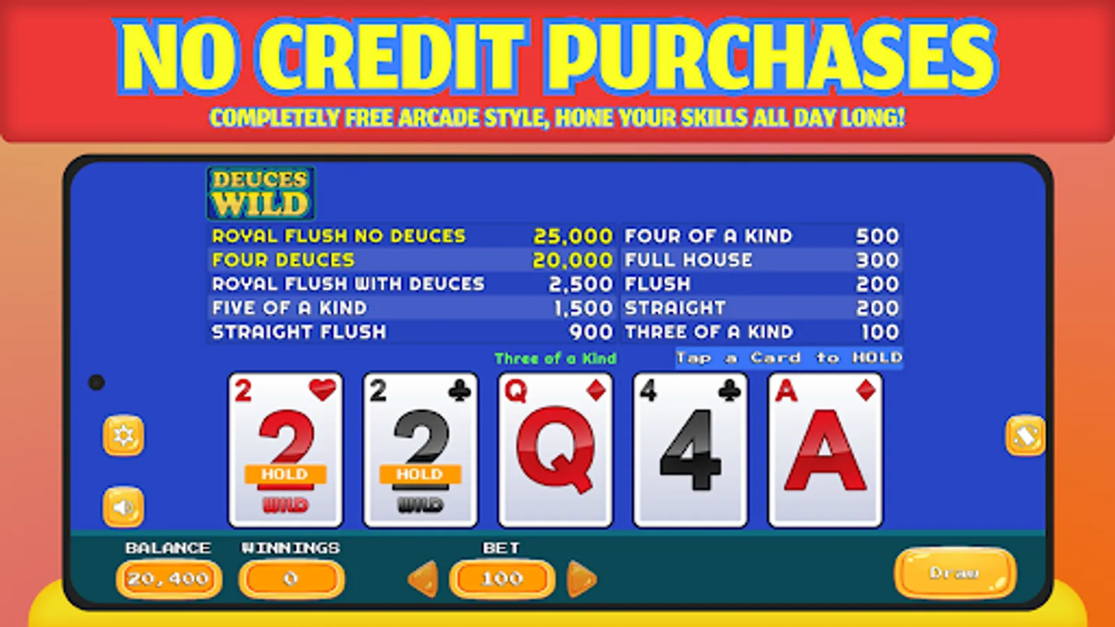 Deuces Wild - Offline is the ultimate poker game for your mobile device! Enjoy the thrill of poker anytime, anywhere, without any internet connection or money involved. Just tap to play and see if you can beat the odds!