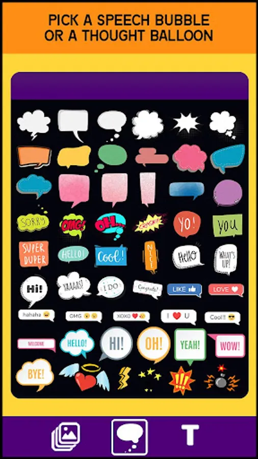 If you want to add "speech bubbles" in all shapes and sizes to personalize your photos either for fun, to "make memes", design comics or jut to write lovely dialogues, this "Speech Bubble Photo Editor" is the app for you. Pick a "speech bubble" from the sticker collection and write text on photo inside the bubble to create an illusion of a dialogue or to display your thoughts. You can add speech bubbles to pictures and make memes, create comics or write romantic messages. Add stickers of onomatopoeias like BOOM and POW, make memes with your own photos or just add text to photos to decorate your images. Try and express your creativity while you use these speech bubbles for photos and you can expect spectacular results every time!