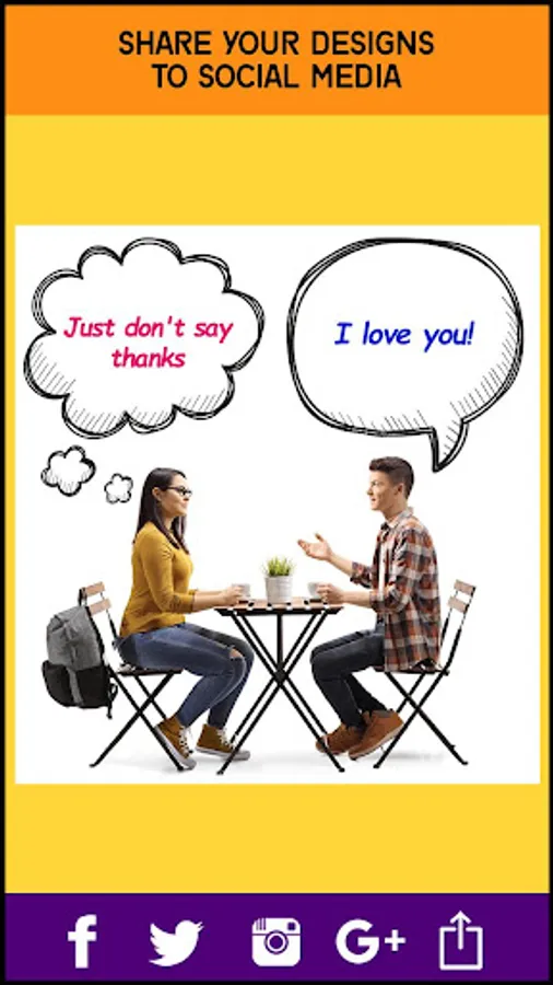 You can completely change a photo's appearance by adding a thinking cloud and some text inside it that will make the picture funny, romantic, sarcastic or whatever you want. Let your imagination run wild and create the coolest photo montages with your pets having silly thoughts, your conversation partner thinking about something completely else why you talk to them, or share your crazy ideas that come to mind through the use of this Speech Bubble Photo Editor. Use motivational quotes to show your positive state of mind, or sarcasm as a response to someone in your photo talks speech bubbles.