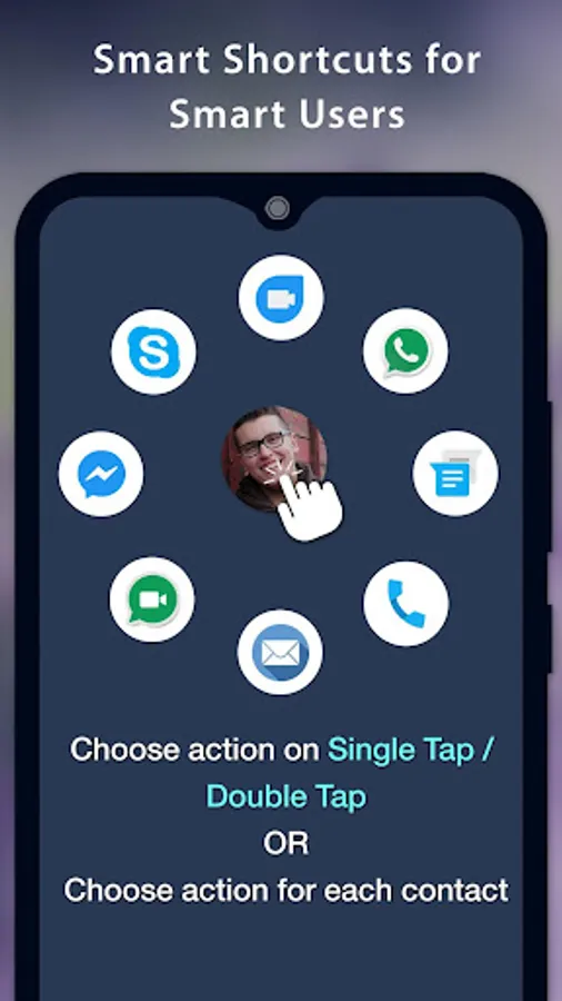 1) Just one tap and do Actions : Phone Call , SMS , WhatsApp message, WhatsApp Call , Skype call, Facebook messenger, Google Duo Video call.