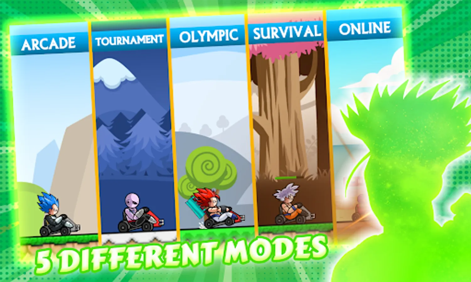 Choose between 5 different gameplay modes: Races, Tournament, Team Mode (Olympic), Team Mode (Survival) or Online Mode. You gain new Stick Z balls by winning tournament kart races. Use those Dragon Z balls to perform super ssj transformations of Doku and other Stick Z fighters and Dragon Z warriors. Use the 7th Dragon Z ball to purchase new Dragon Z warriors.