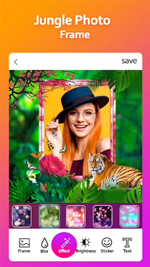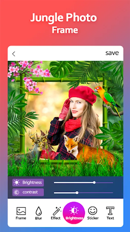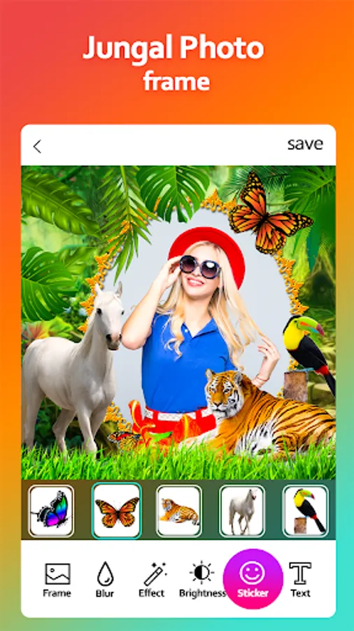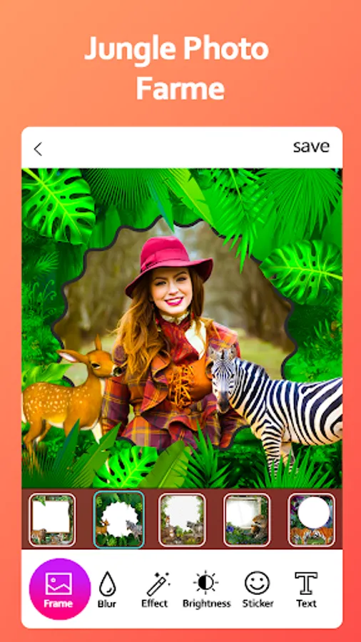 Jungle Photo frame is nice app that lets you customize your photos. Choose a photo from your gallery or take it with the camera of your device, select a frame and generate your photo.