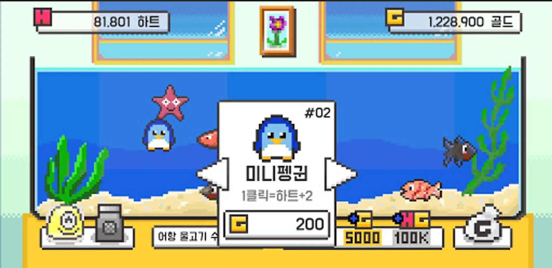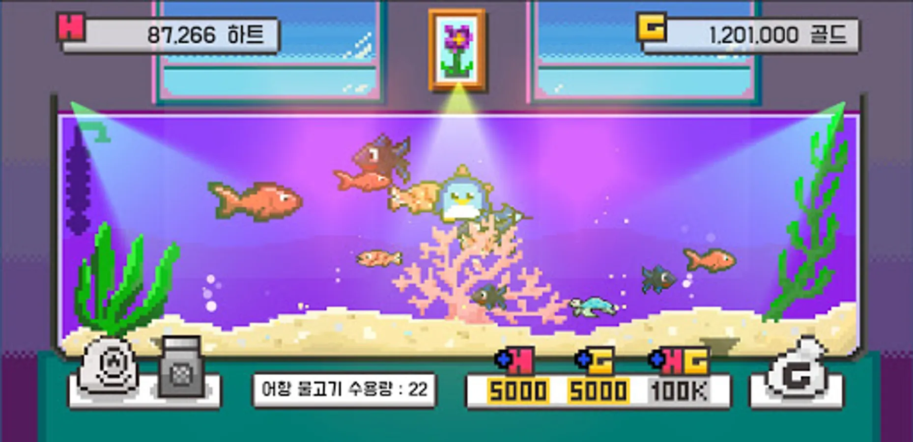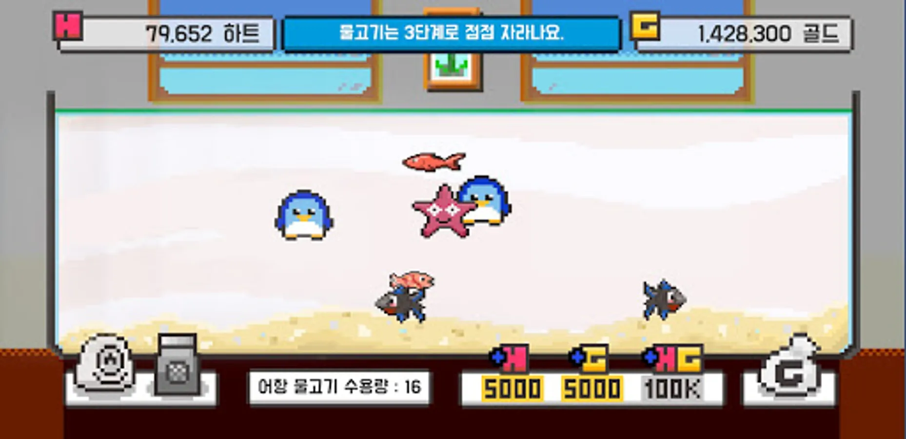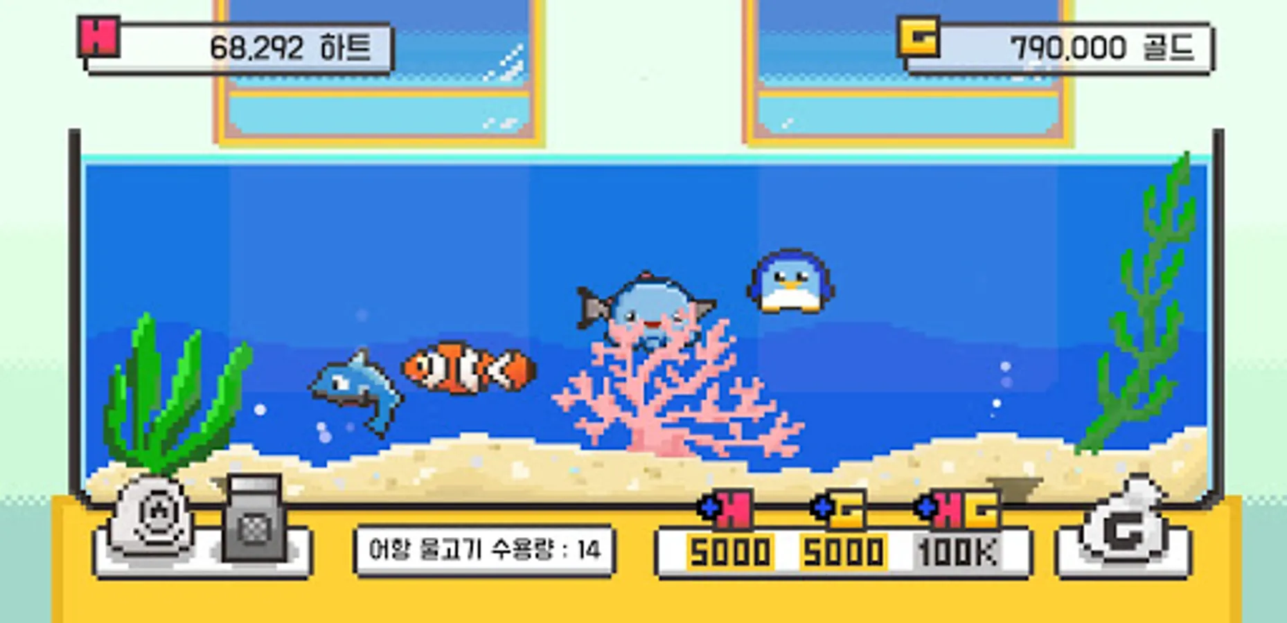 -Open the hidden cute fish with H (heart) and buy the fish with G (gold). If you touch, look, and grow well, you can get triple gold and sell it back. You can buy more fish by collecting gold like that.