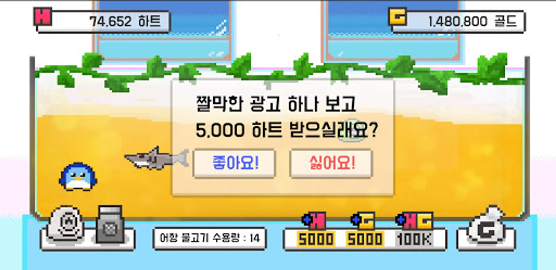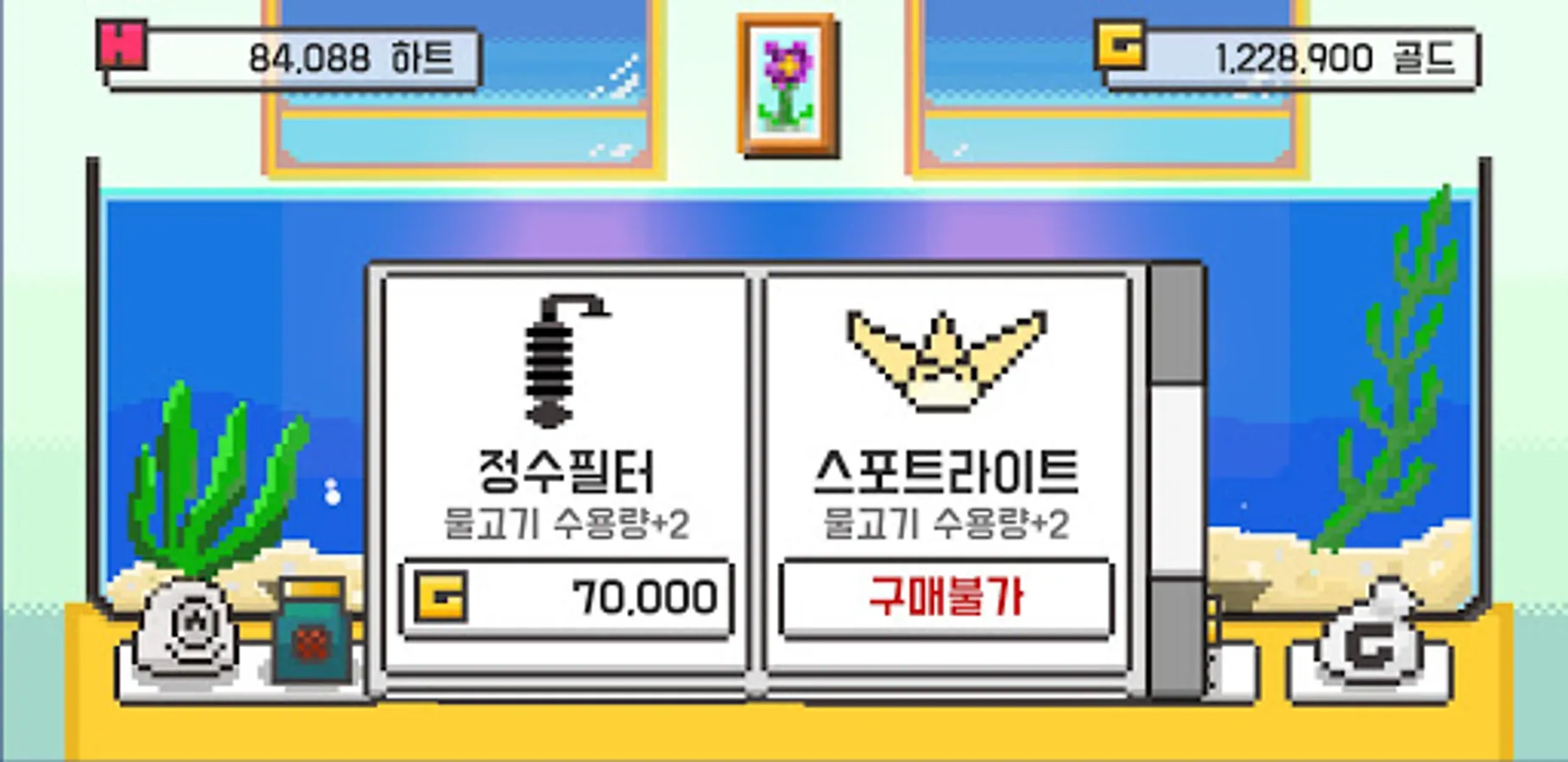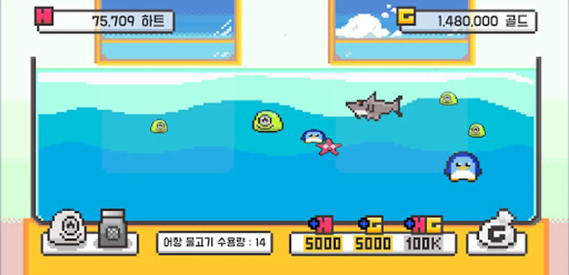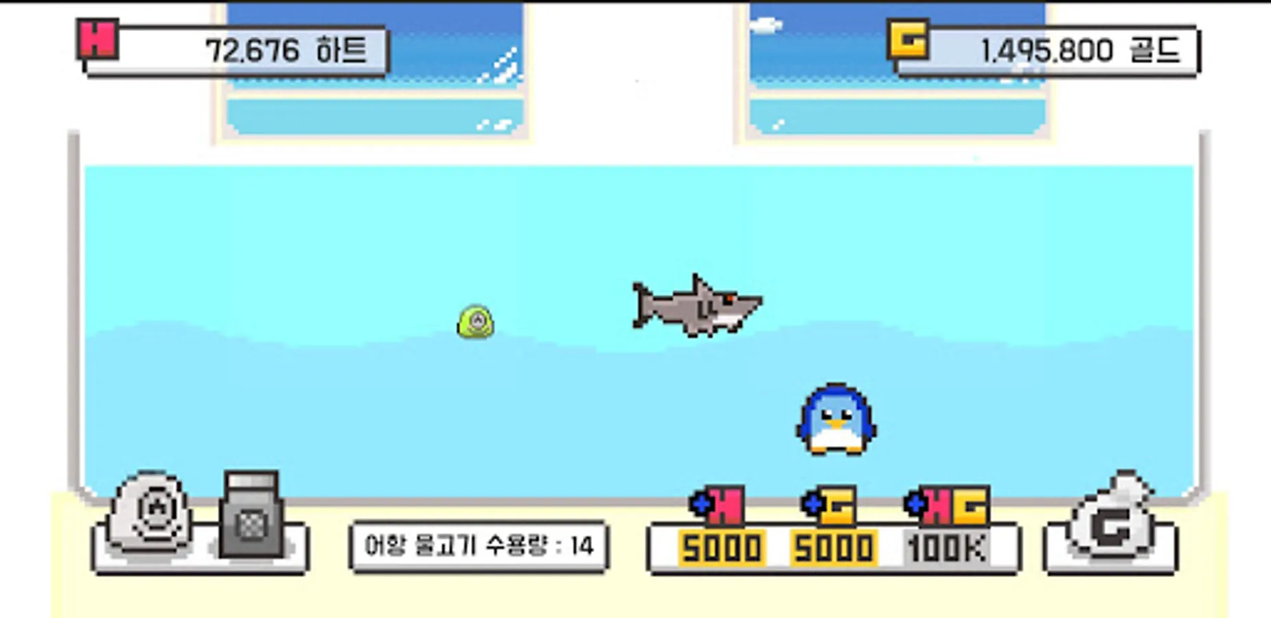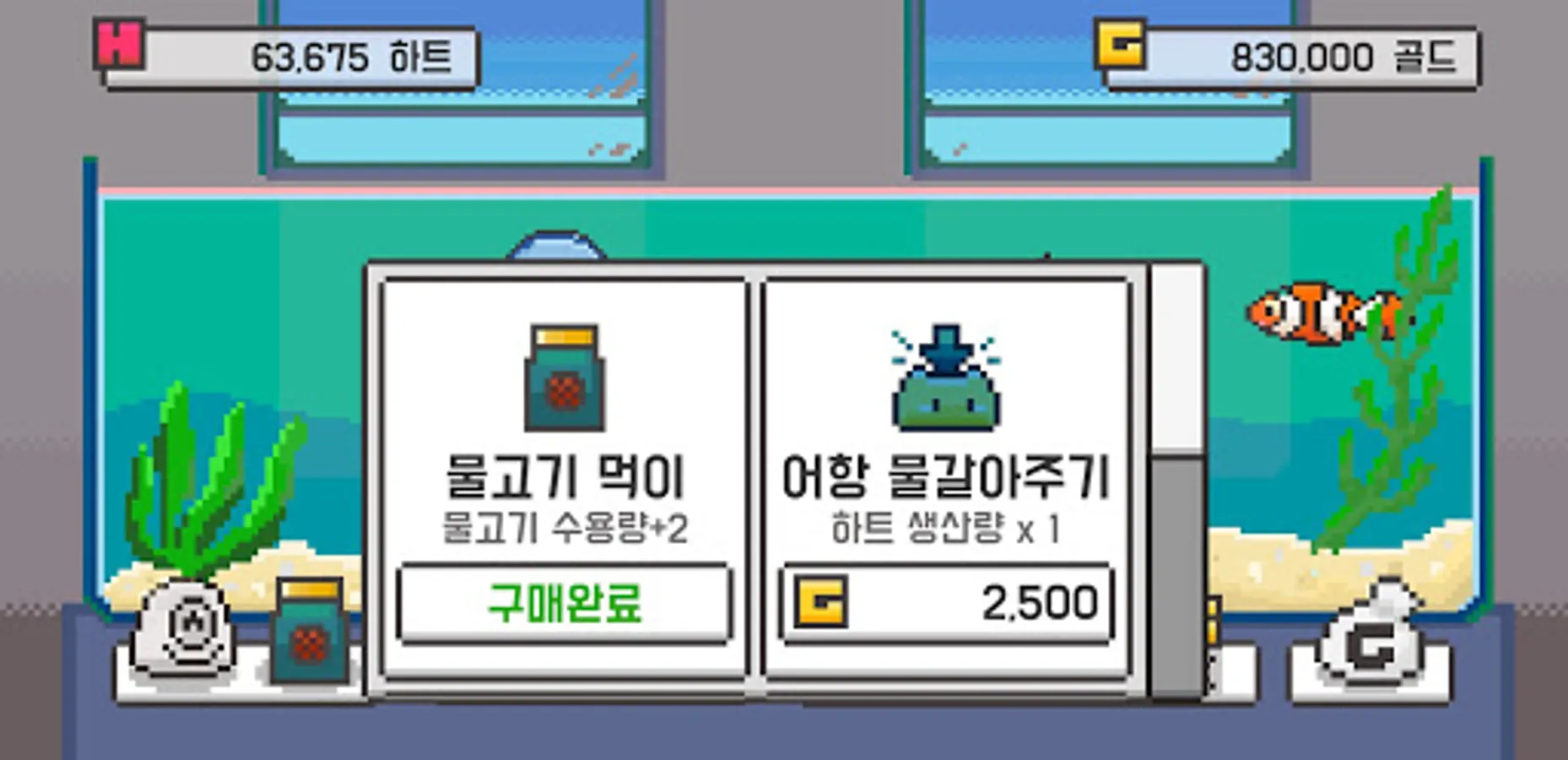 -Open the hidden cute fish with H (heart) and buy the fish with G (gold). If you touch, look, and grow well, you can get triple gold and sell it back. You can buy more fish by collecting gold like that.