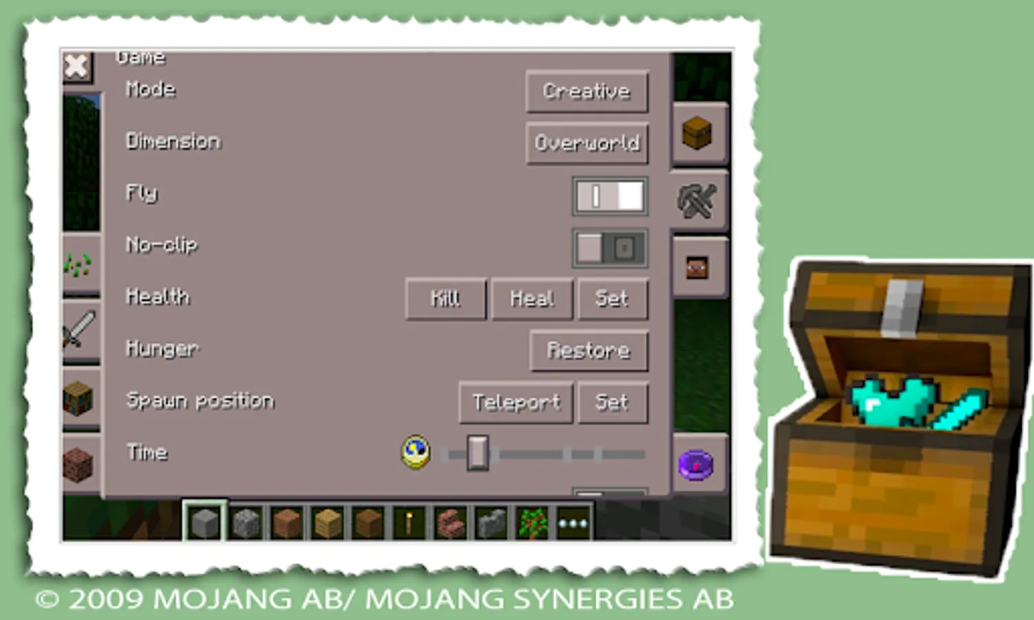 Toolbox or gamemode in Minecraft Bedrock. This mobile application gives easy access to all types of blocks in Minecraft. Changing settings, setting the time of day, survival mode and weather in MCPE. And other auxiliary things: xray, treecapitator, etc.