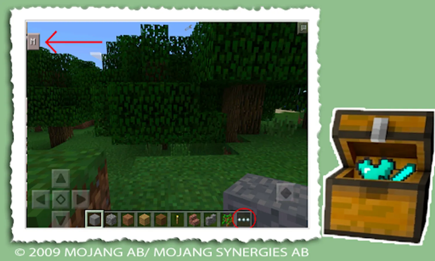 In order to start using our Toolbox add-on in Minecraft PE you need to click on the top left to [M]. After clicking it, you will be taken to the graphical interface for minecraft GUI, where you can access all the functions and new improvements. You can also click on 3 dots to access all vanila items and blocks minecraft, 3 dots are located at the bottom of your smartphone screen. Use the field to search for minecraft objects or scroll down to select the desired item and drag it to the desired cell of the inventory GUI minecraft pe.