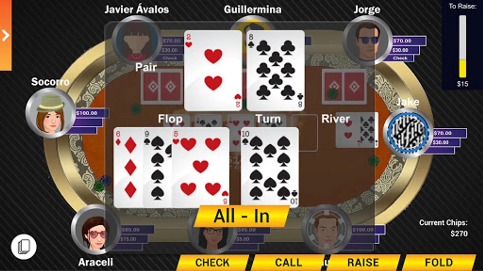 Poker is a game of cards, the principal object its betting, in this app users can play with all or part of their hole cards, place bets on an initial bet, falling the total amount of bets on the player or players with the best combination of letters.