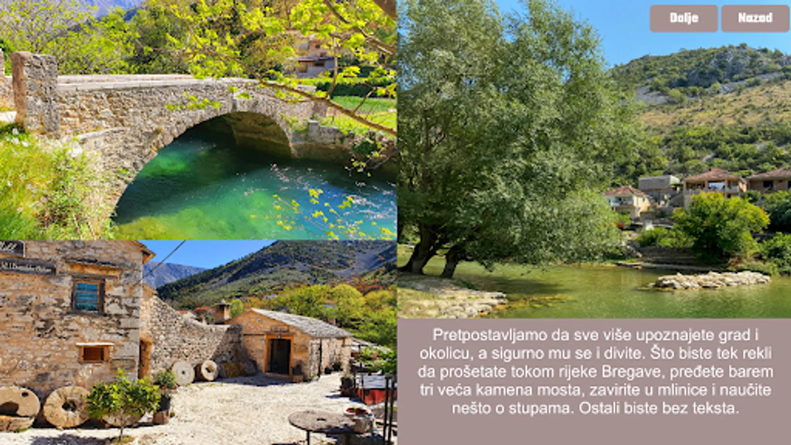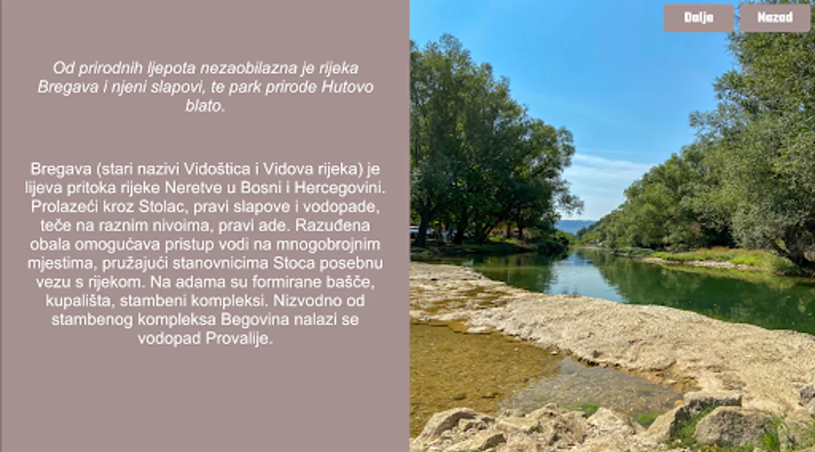 This application was created for "JU Radimlja" - Stolac (Bosnia and Herzegovina), to run on smartboard. Users can interact with the board by clicking on the buttons and get to know the cultural-historical and natural potential of Stolac.