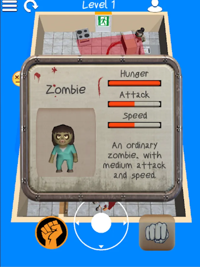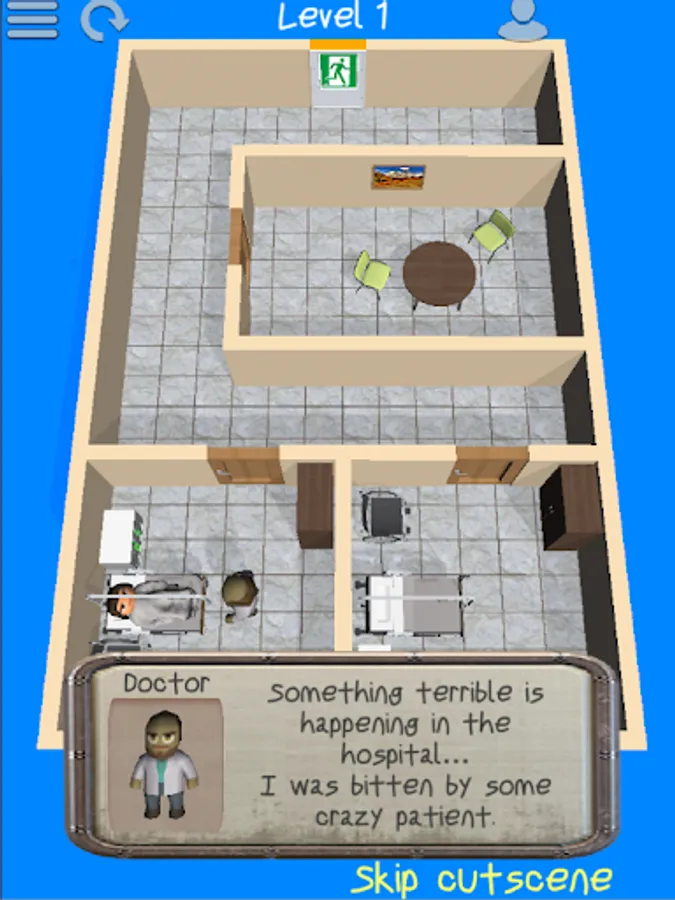 You woke up in a hospital ward in the middle of a zombie apocalypse. Your task is to survive the first day and get out of the zombie hospital. Use your uninfected superior mind and fool rotten-brain zombies. Stealth mode is your primary weapon.