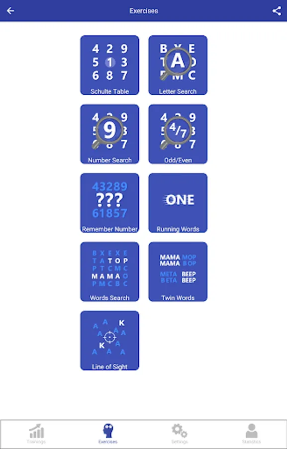 The application includes exercises, such as Schulte tables, that have already proven to be effective and other unique specially created exercises.