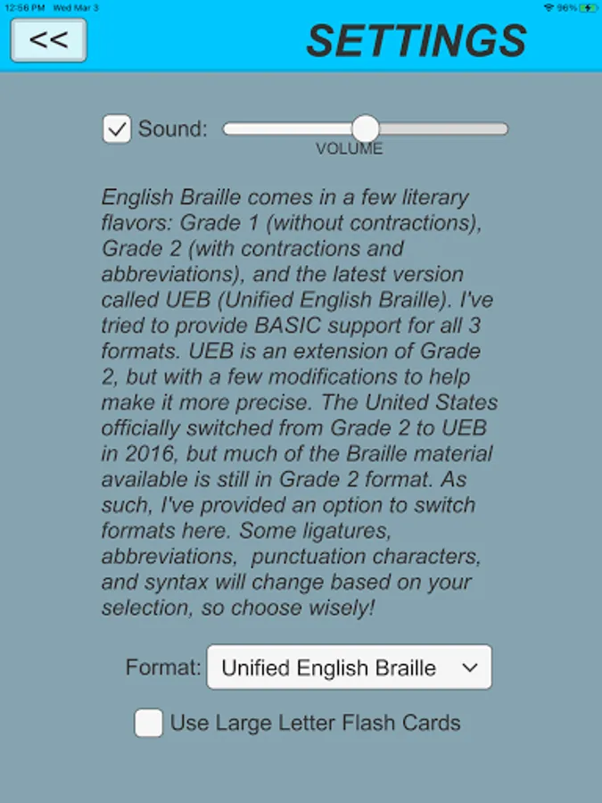 Learn Braille the fun & easy way! Flash Cards, Symbol References, Instant Text Translations, plus Braille Word Games! Copy and Paste Braille messages to your friends! Support for Braille Grades 1 & 2, plus Unified English Braille. Great resource for anyone wanting to learn Braille.