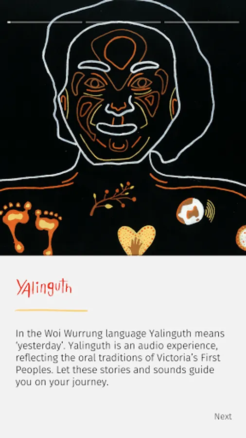 Yalinguth (“yesterday” in Woi Wurrung) is a mobile app/ audio augmented reality experience that connects people to place and history through geo-located soundscapes and stories told by Aboriginal and Torres Strait Islander communities. In keeping with oral traditions, and to minimise screens, Yalinguth is expressed entirely through sound. The overall premise of Yalinguth is guided by the words of the Elders that “we need to go back, to go forwards”.