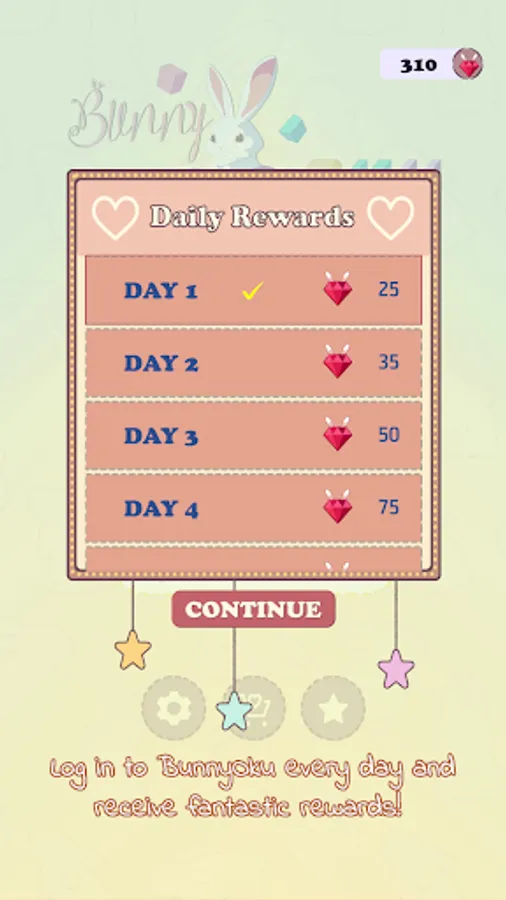 ✨ Daily Login Rewards ✨ Log in to BunnyOku every day and receive fantastic rewards! Earn gems by simply opening the game. Don't miss out on these daily rewards, as they can greatly enhance your gameplay experience. Come back each day to claim your rewards and make your journey in BunnyOku even more exciting!