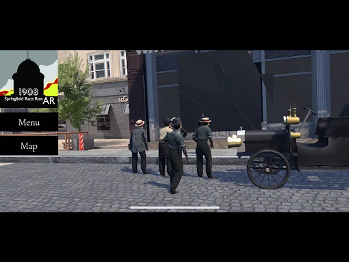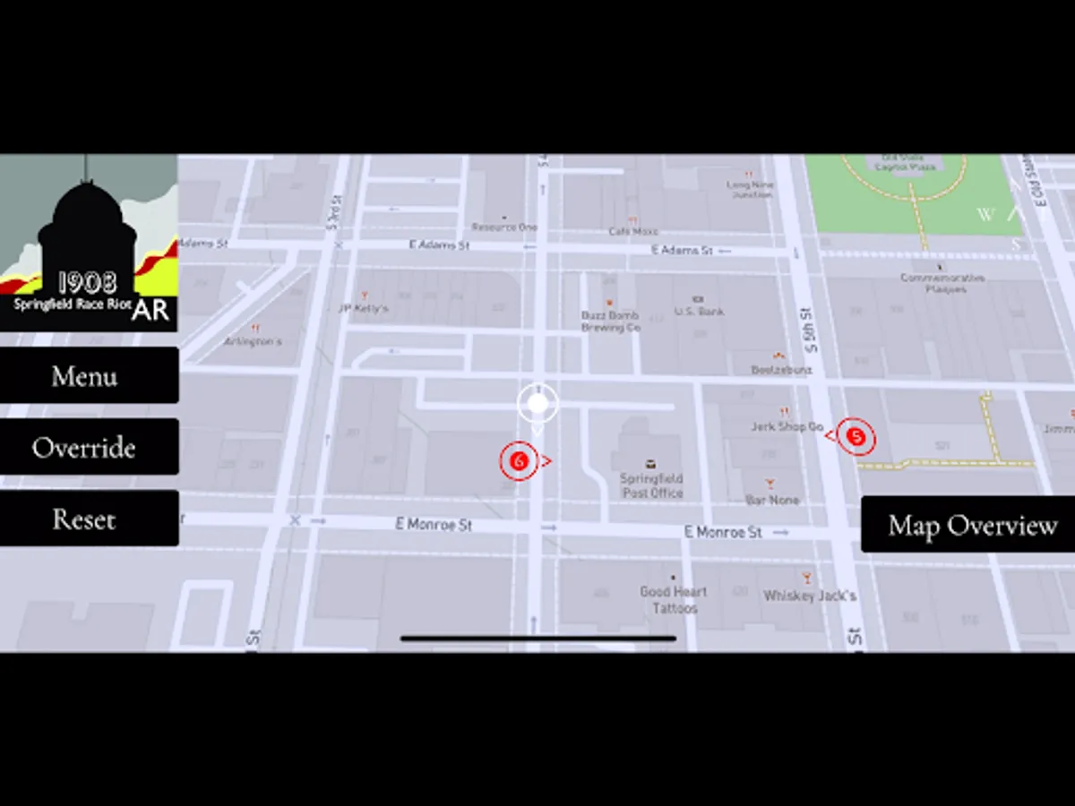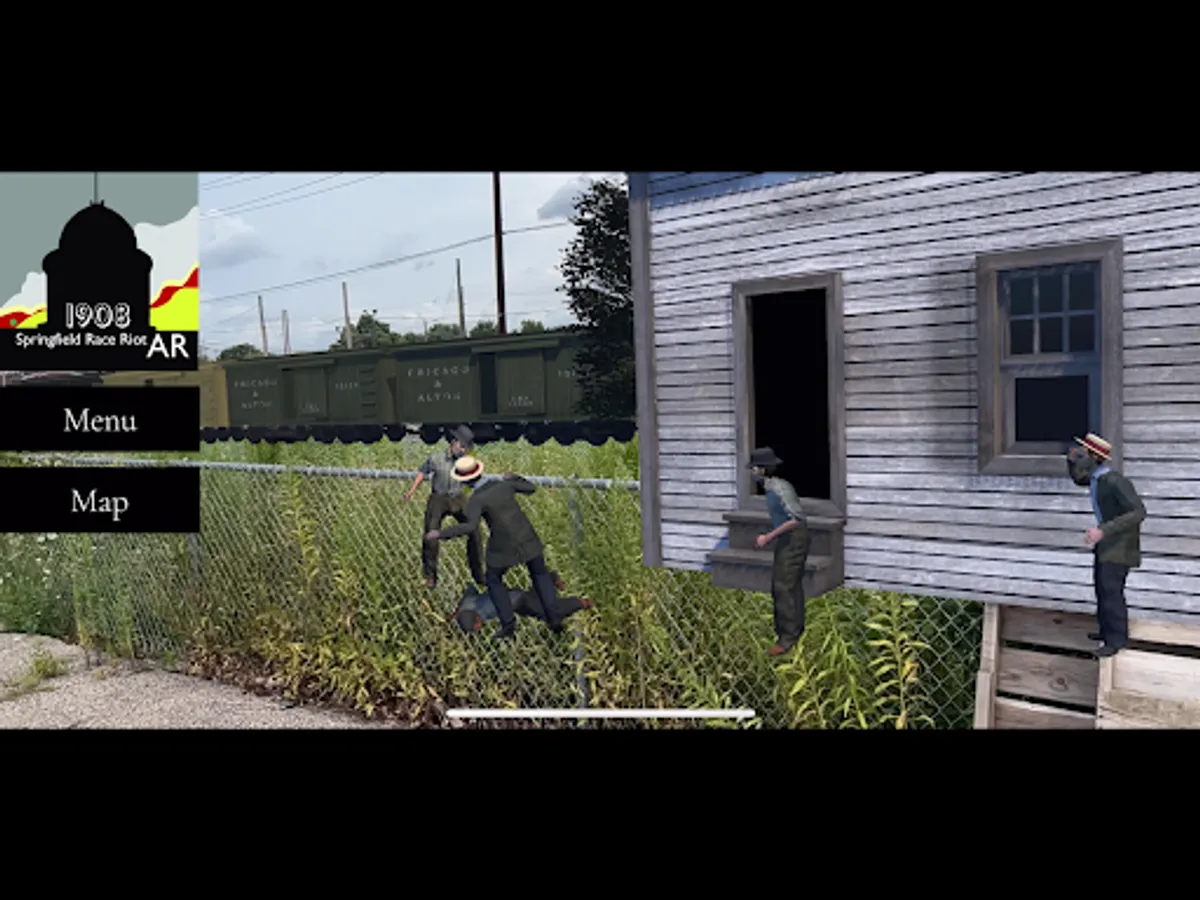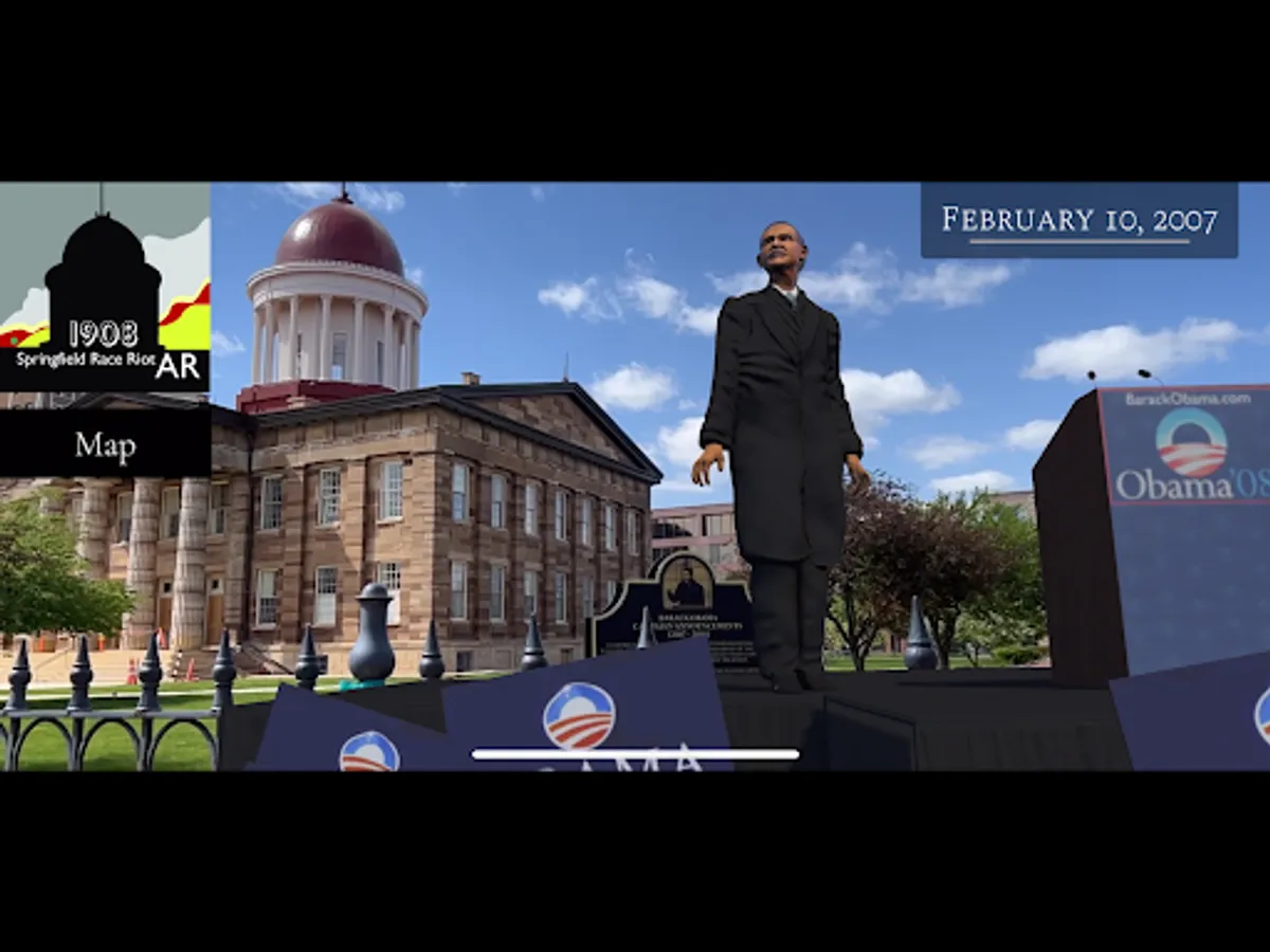 1908 Race Riot AR is an Augmented Reality-based mobile app that presents the 1908 Springfield, Illinois Race Riot, a horrific episode of racial violence perpetrated against African Americans in the Capitol of the State of Illinois which led to the founding of the NAACP. The app provides visitors with the ability to follow a self-guided tour of downtown Springfield, Illinois that presents the event and how it unfolded over three days. The app is centered around a GPS-based map that guides visitors to nine numbered AR stop locations. Each AR stop represents a place of significance where users are able to view animated AR recreations of events that took place. These animated AR recreations are viewed as overlays on the real present day landscape. The app was made possible by the US National Park Service’s Abraham Lincoln Home and the organization Looking for Lincoln.