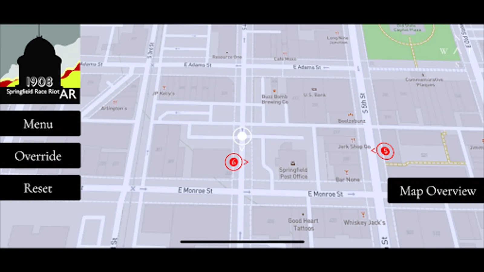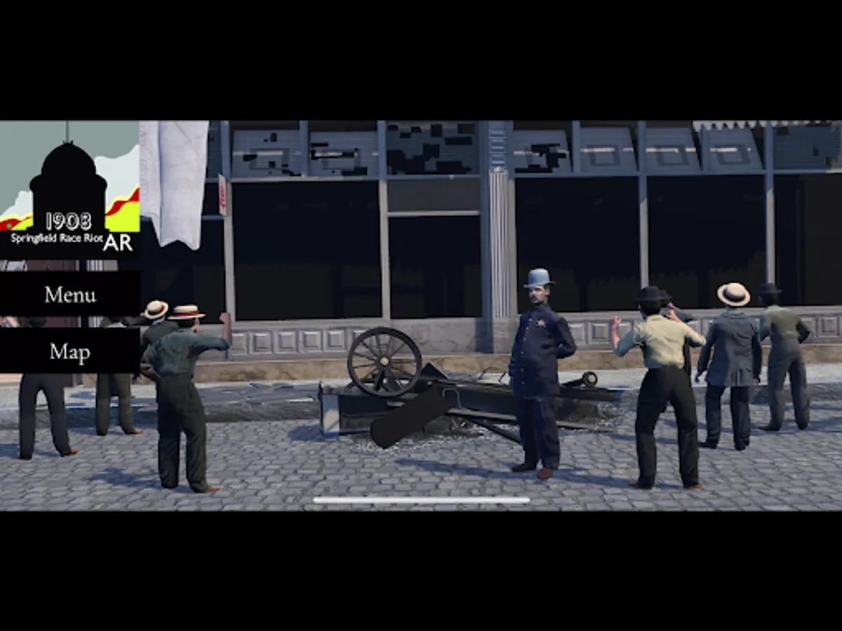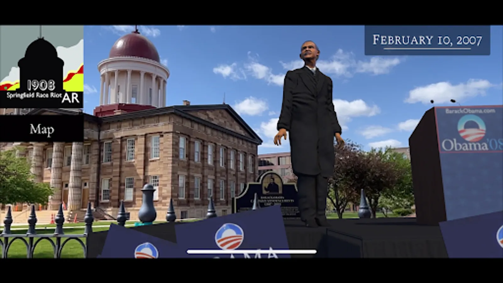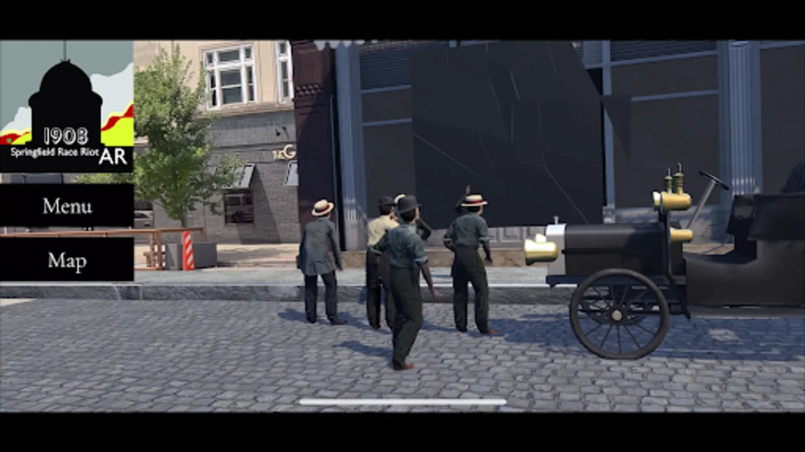 1908 Race Riot AR is an Augmented Reality-based mobile app that presents the 1908 Springfield, Illinois Race Riot, a horrific episode of racial violence perpetrated against African Americans in the Capitol of the State of Illinois which led to the founding of the NAACP. The app provides visitors with the ability to follow a self-guided tour of downtown Springfield, Illinois that presents the event and how it unfolded over three days. The app is centered around a GPS-based map that guides visitors to nine numbered AR stop locations. Each AR stop represents a place of significance where users are able to view animated AR recreations of events that took place. These animated AR recreations are viewed as overlays on the real present day landscape. The app was made possible by the US National Park Service’s Abraham Lincoln Home and the organization Looking for Lincoln.
