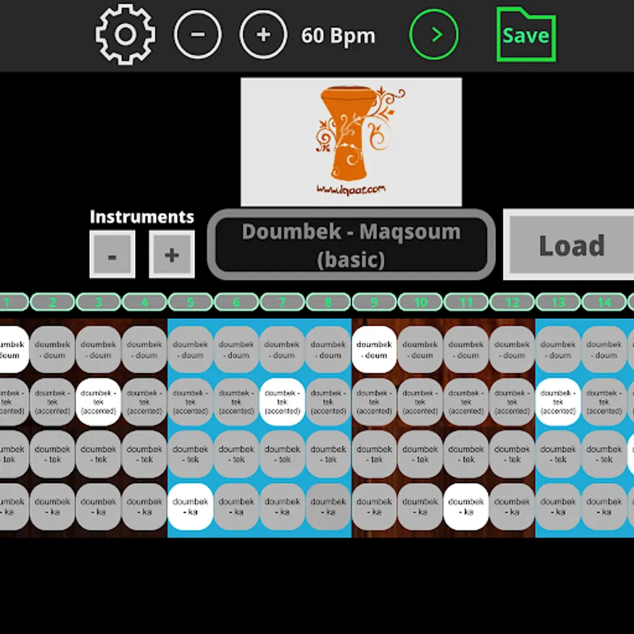 Drum tab app to practice and learn hand drum rhythms. Has sounds for Arabic/Middle Eastern drums doumbek/darbouka, riqq and tar. Also has sounds for the ney.