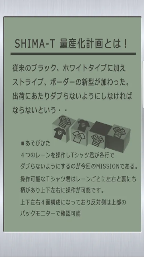 This MISSION is to operate the four lanes and prevent T-shirts from dubbing on each line. The operable Shimazu T-shirt has a pattern on the left, right and back of each lane and can be operated up, down, left and right.