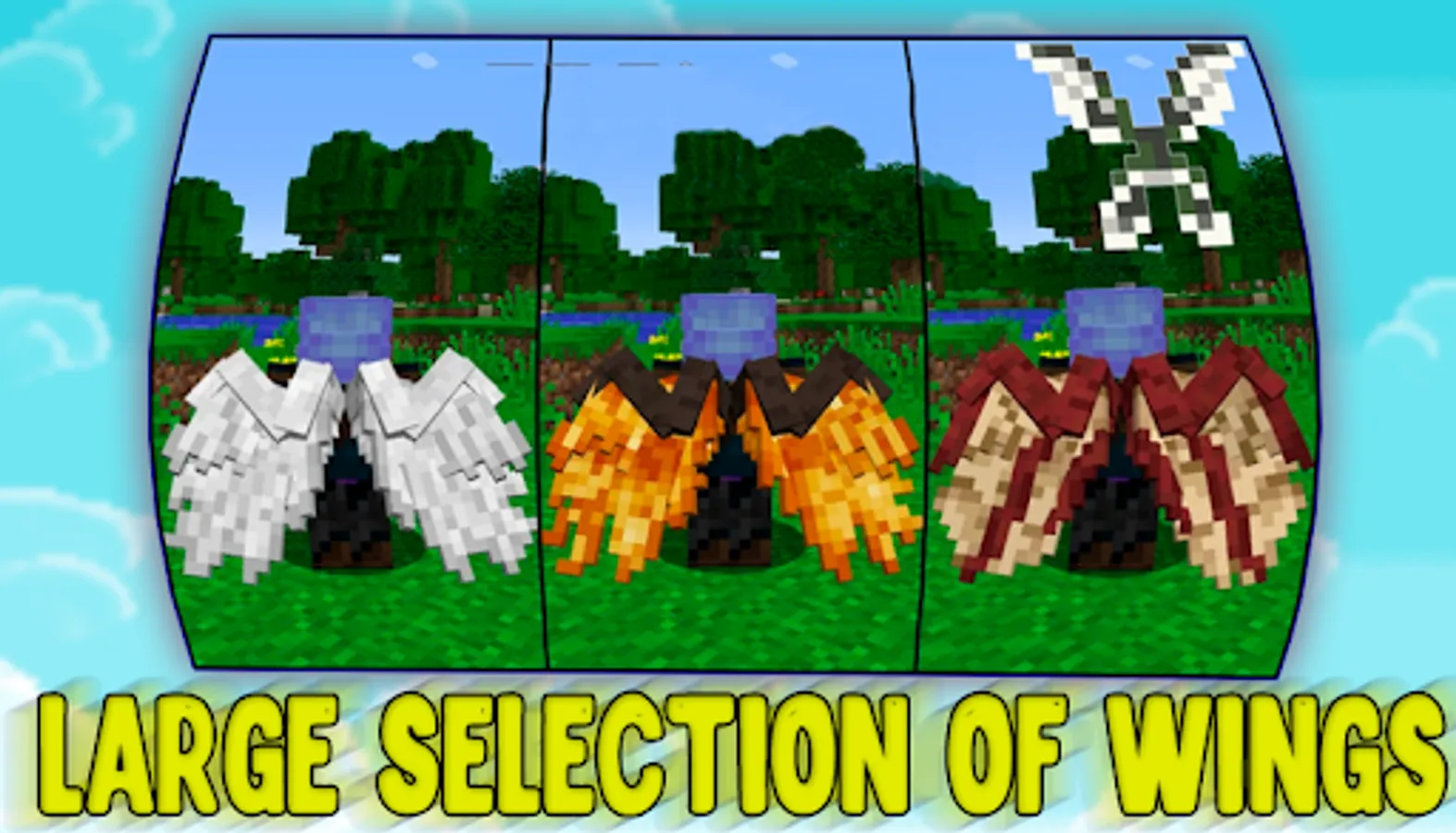 We present you an updated version of the wings for minecraft pocket edition. New texture packs that add more than 100 new types of wings and armor wings! In the mobile application, you can see 4 different sets of textures for your pixel world! For each mod, different wings, as well as different crafting systems, which are described in detail in the minecraft pe game or inside the application! This mod for mcpe will bring you a lot of visual pleasure and convenience in moving around the minecraft world!