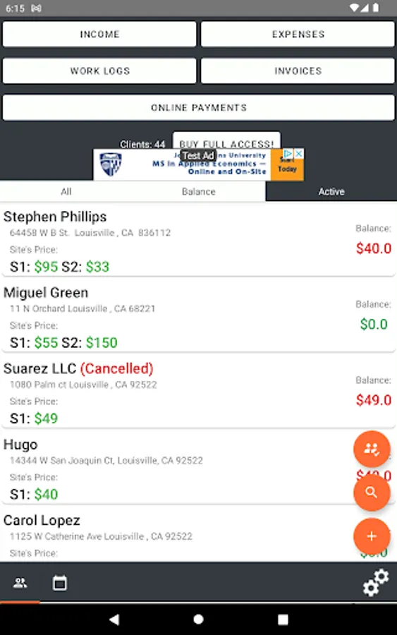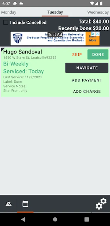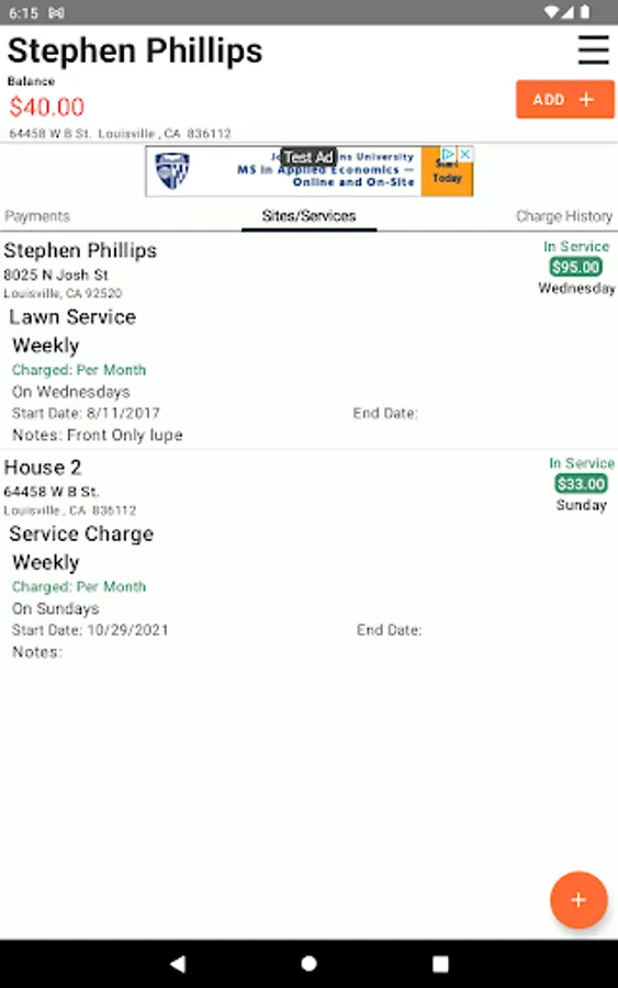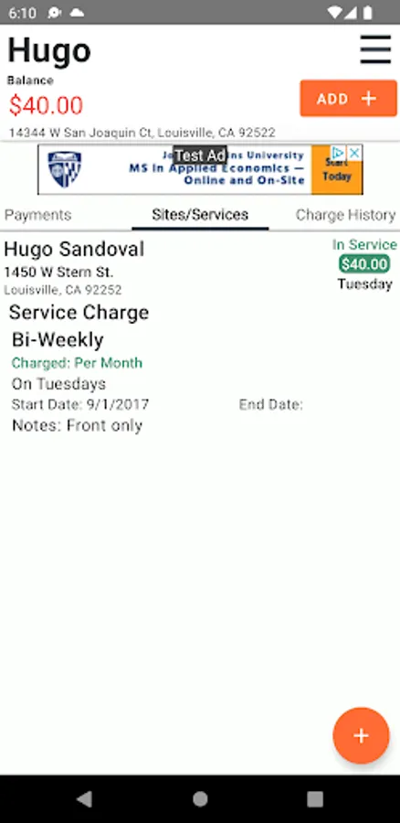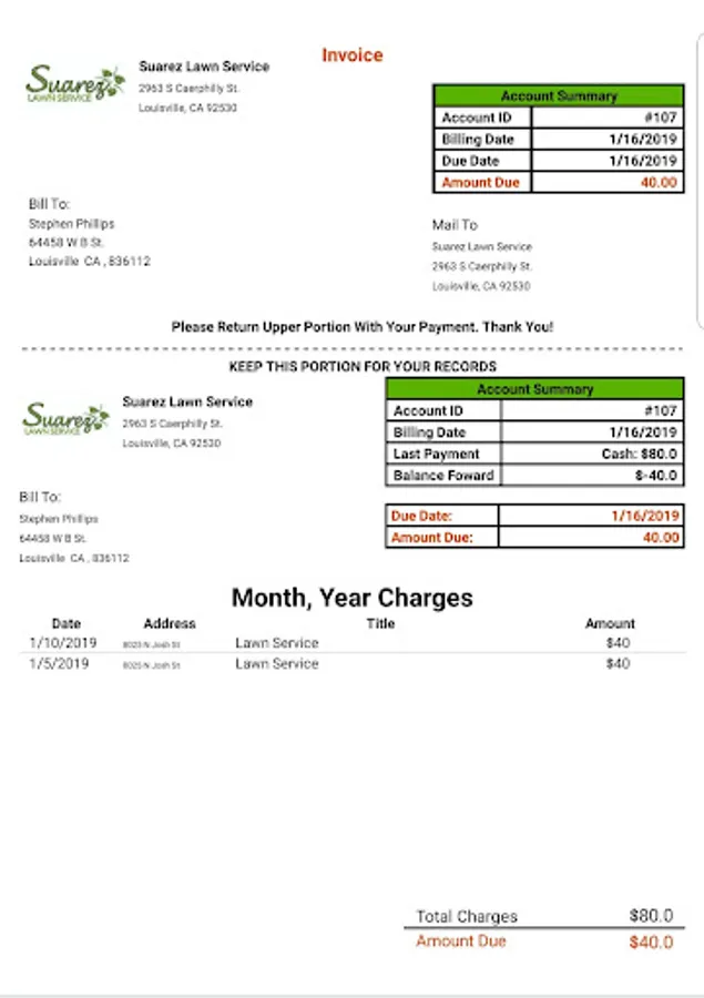 Job Sites/Services: Each of clients have one or more job sites that you service, you can manage each one of them and keep track of their info. (Address, Monthly price, day of service, frequency, etc.).