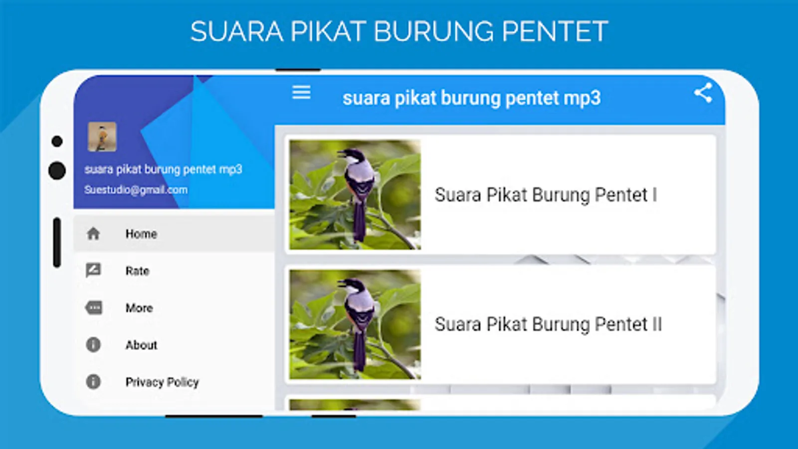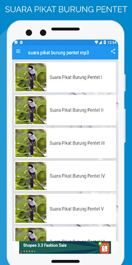 The application of the sound of attracting pentet birds mp3 is a sound application to lure pentet birds in the wild. This sound is perfect for all friends who like to attract pentet birds. Only using this application you can attract which we make this application practically so that it is easy to use. and hopefully with this application it can be useful and useful for all my friends, this application can also be used to memaster your birds at home so that they are diligent in chirping sweetly like pentet birds that are gacor and tame