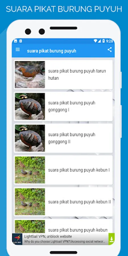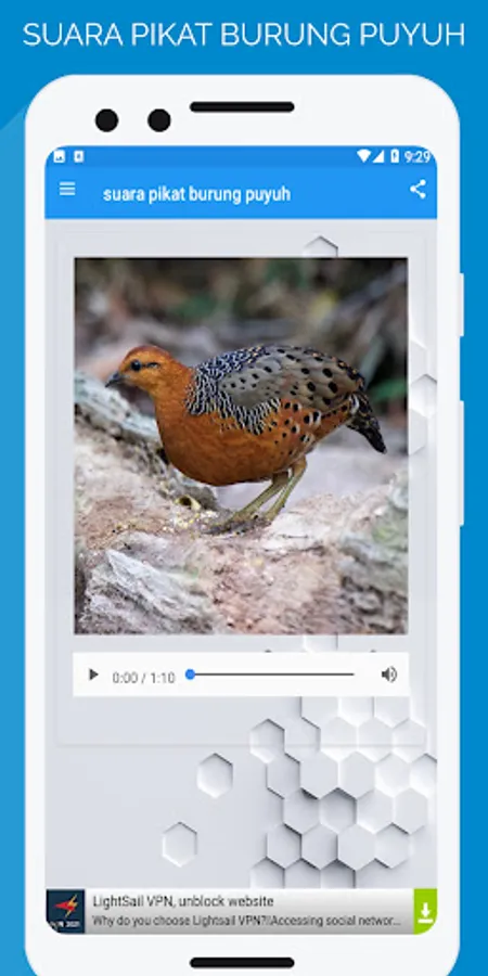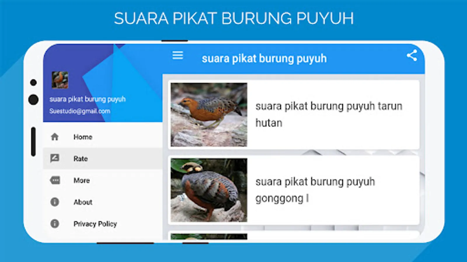 The quail sound application is an mp3 sound application to attract quail in the wild. This sound is very suitable to be used to attract quail. Just by playing audio in the application, you can attract quail easily. This audio can also be used to train your quail. at home to be diligent in chirping