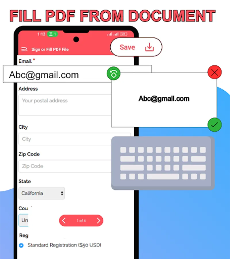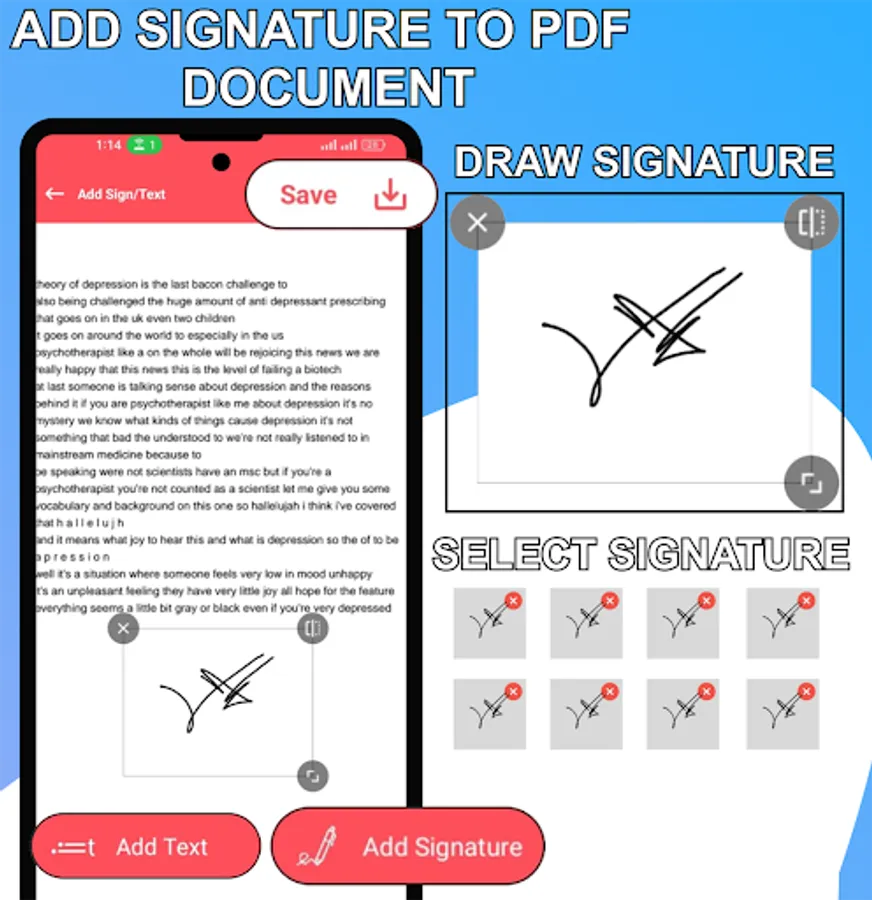 Using sign pdf documents on android, you can sign the pdf document with the drawn signature of with digital signature. The app also makes signatures with multiple fonts. Draw, or make a digital Signature. Select documents and fill in signature, initials, date, email, images, or any type of text like address, phone numbers, etc. All on the pdf maker and signature creator app.