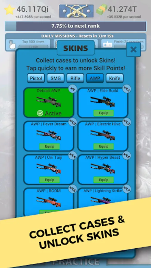 Counter clicker has everything you ask from a global idle clicking strike adventure such as chests, skins, weapons, ranks, mini games and more! Tap and earn money, click and rank up in this offensive csgo like tapping simulation!