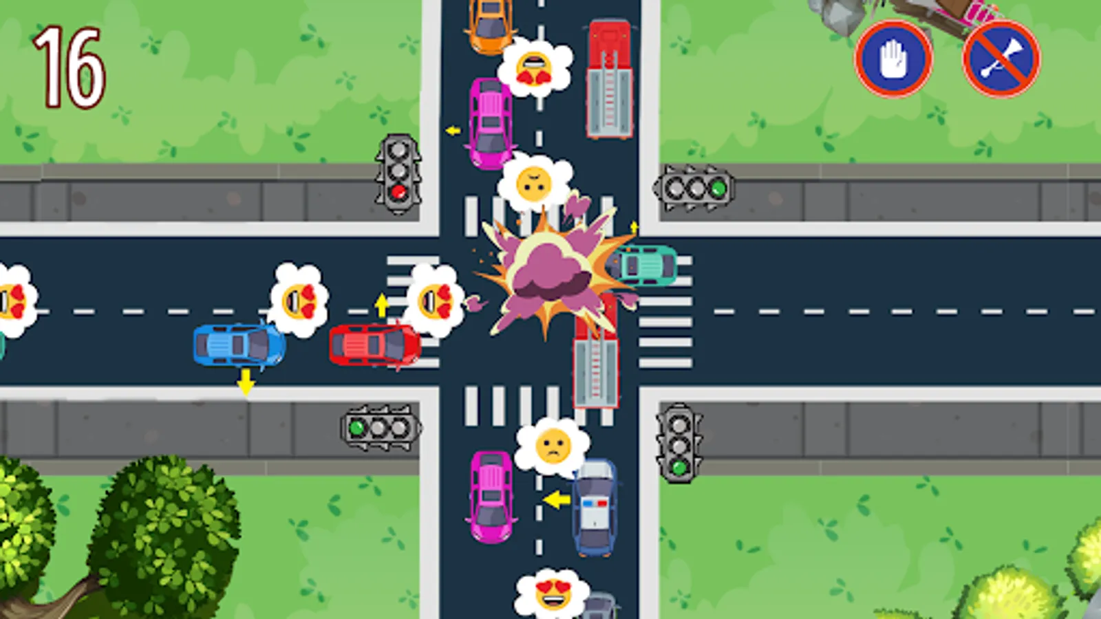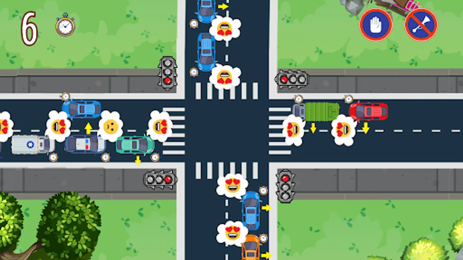 Watch out for the thought bubbles of drivers and their colors. Once it turns red, you have little time to let the vehicle pass the traffic lights. Once a driver is out of patience and can’t take the traffic anymore, their bubble turns purple, representing the game is over for you and the police take over the intersection. How many cars can you help before the drivers snap and the police arrive?