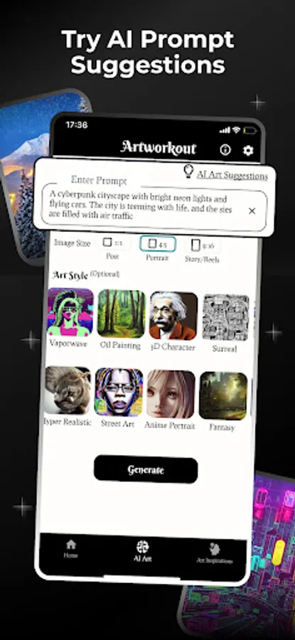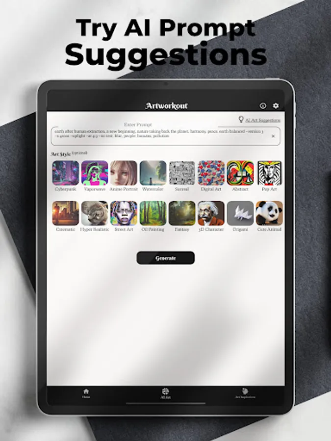 It's easy to use, type in the artwork idea, select the art style (optional), hit the generate button and then watch 'AI Art Generator: Artworkout' turns your words into stunning masterpieces. You can choose from many of art styles such as hyperrealistic, oil painting, digital art, cyberpunk, cinematic ect.