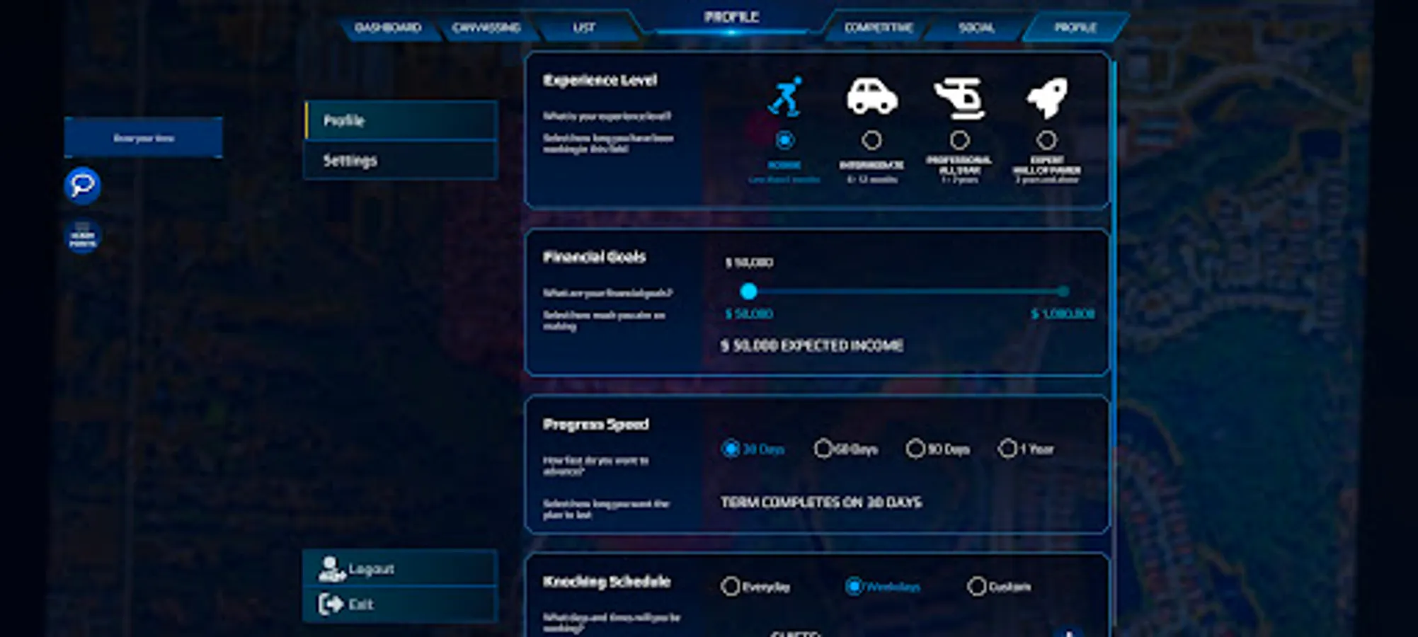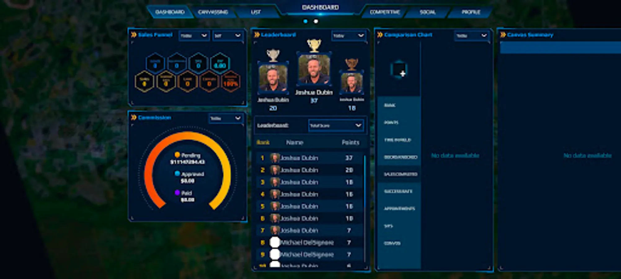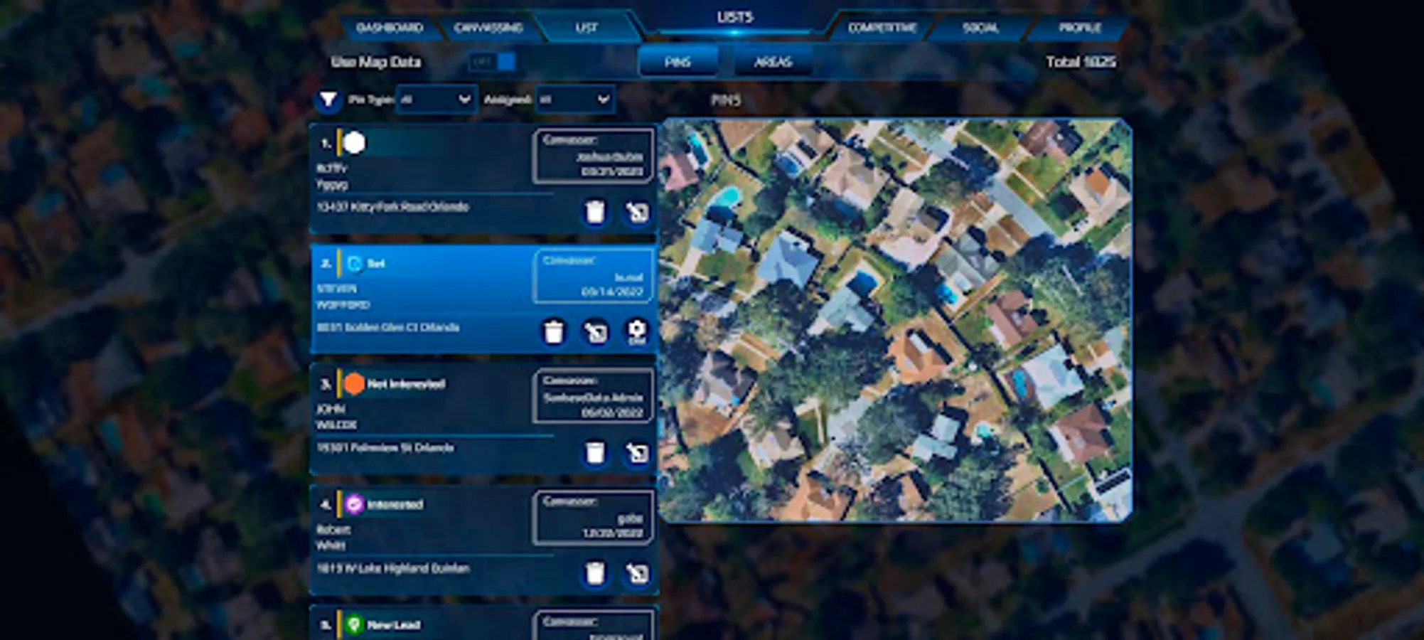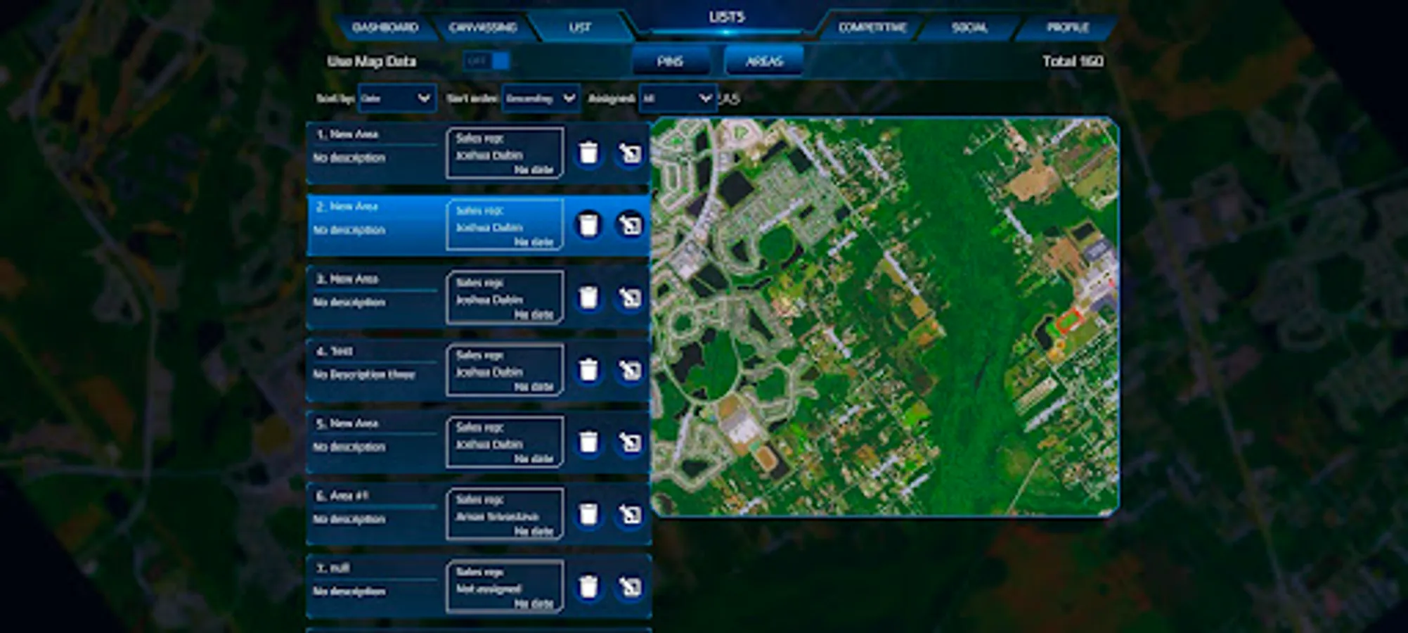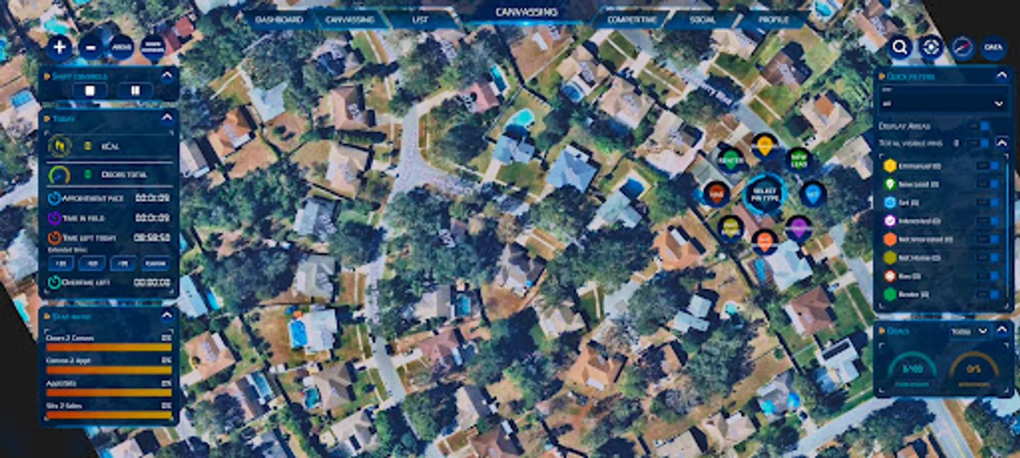 The most advanced D2D software with custom user specific profiles. Configure KPI plans based on experience levels and income targets. Carve areas. Homeowner data, territory assignments. View real time analytics like time in field, activity, tracking (steps, calories, disnance), and pace (doors and appointments per hour)
