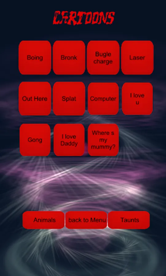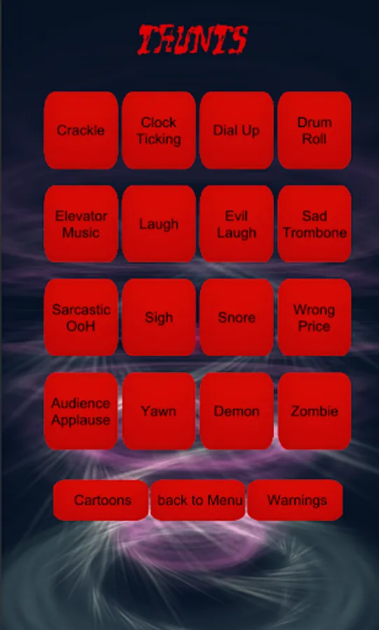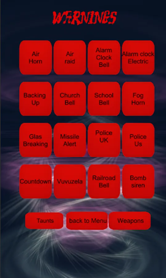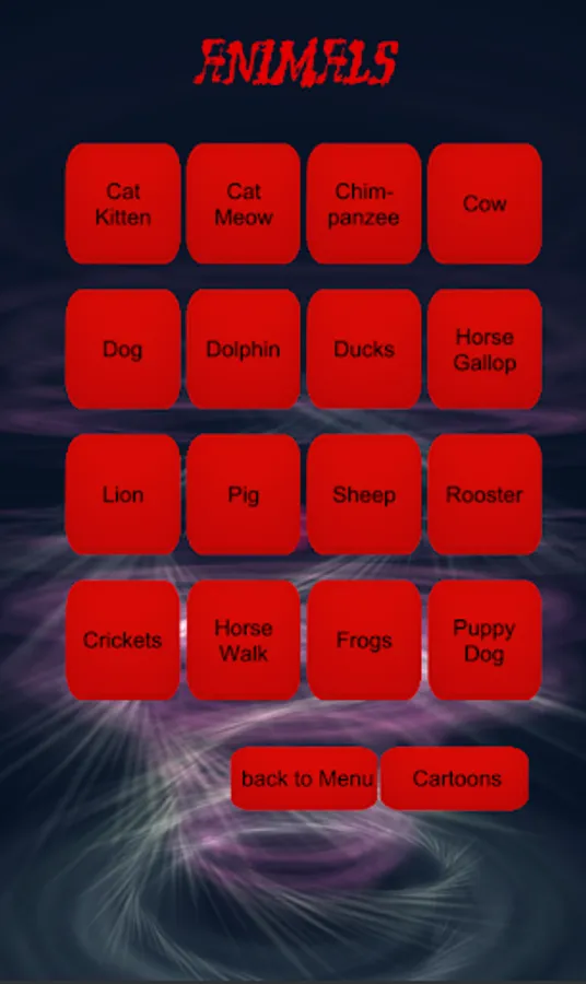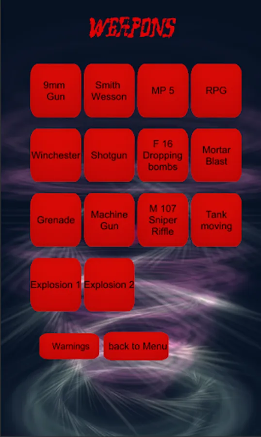 Cette application est un simulateur de sons des catégories: animaux, cartoon, raillerie, avertissements et armes.