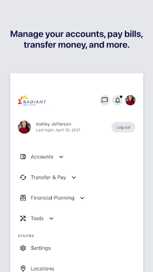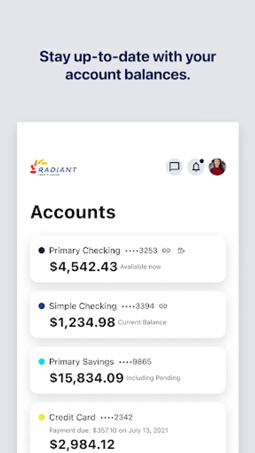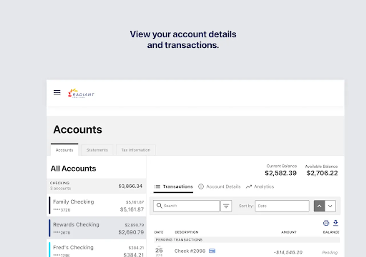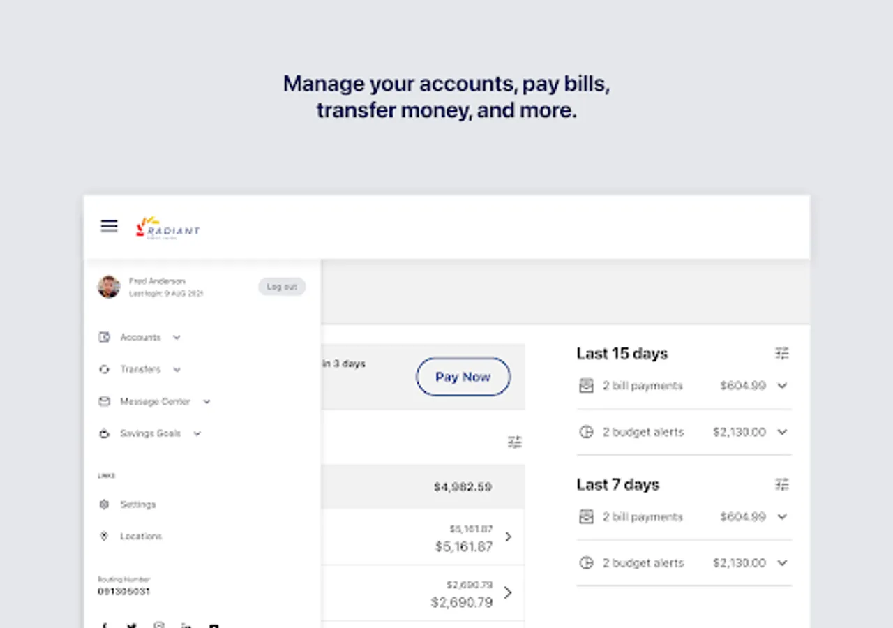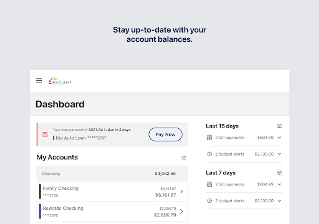 Manage your accounts, pay bills, view copies of your cleared checks, and view transaction history. Members can also make quick transfers within Radiant accounts and find the closest ATM in Radiant’s network.