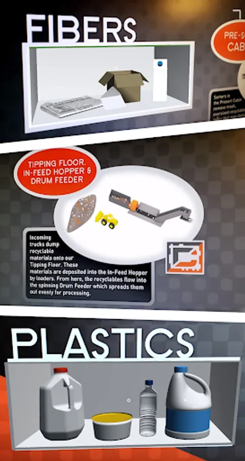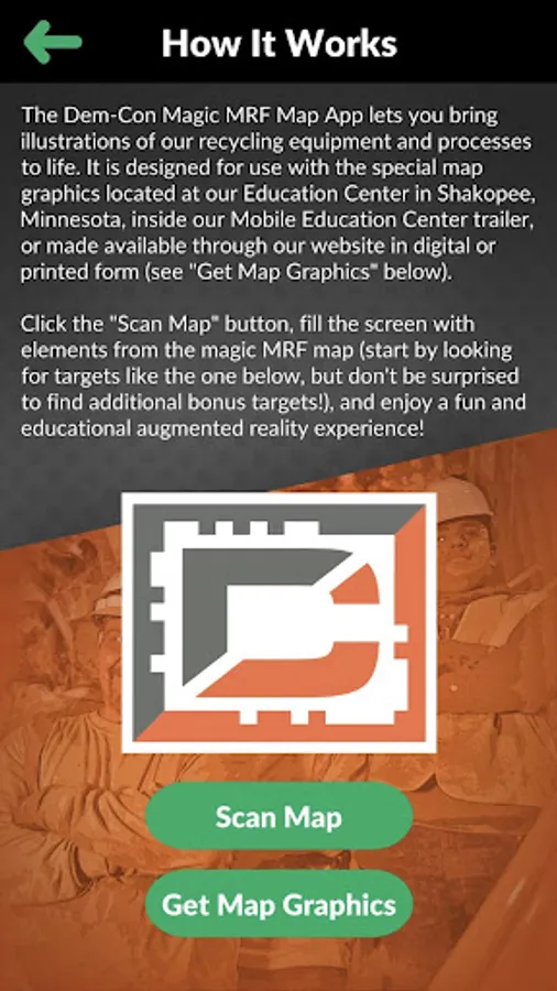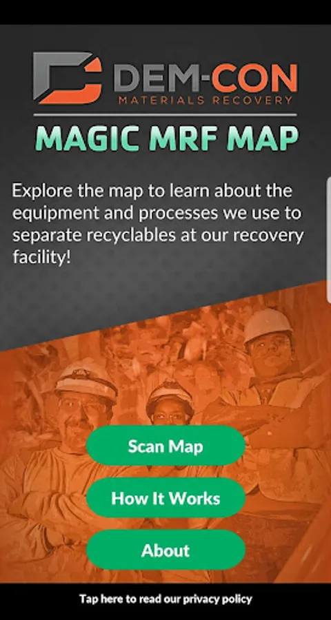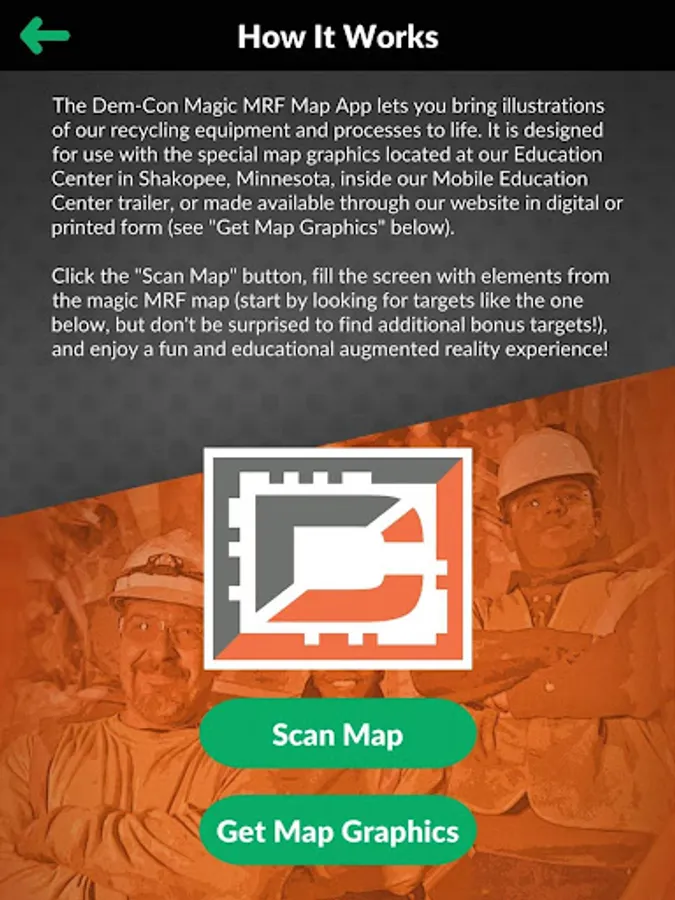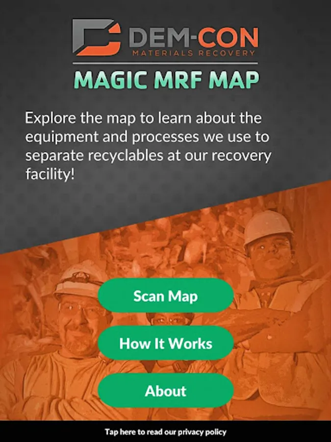 The Dem-Con Magic MRF Map app lets you bring illustrations of our recycling equipment and processes to life with the power of augmented reality. It is designed for use with the special map graphics located at our Education Center in Shakopee, Minnesota, inside our Mobile Education Center trailer, or made available through our website in digital or printed form.